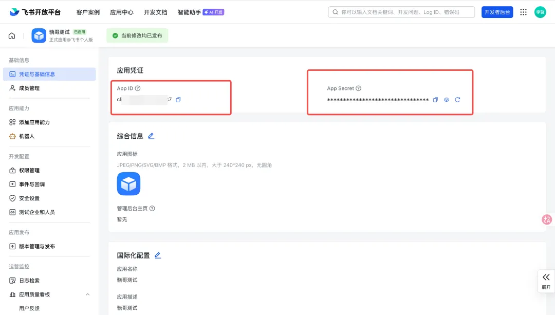 然后回到「凭证与基础信息」,记住App ID和App Secret,这个是后面要给OpenClaw的🦞