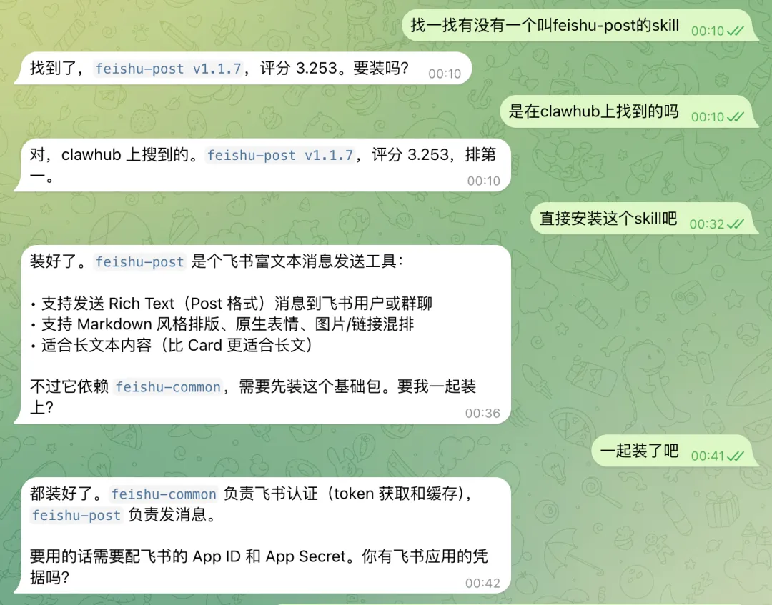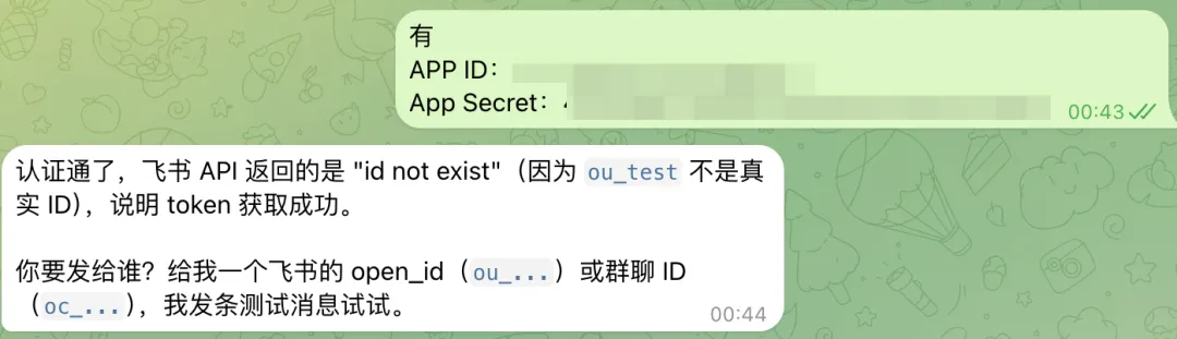 装好feishu-post和feishu-common后,再把我们刚刚飞书机器人的App ID和App Secret 给他