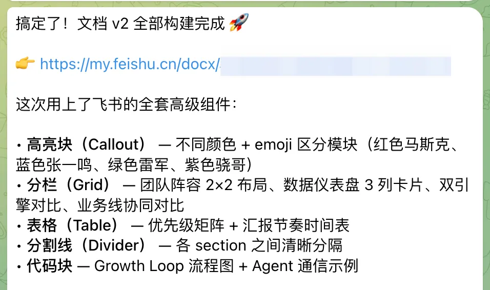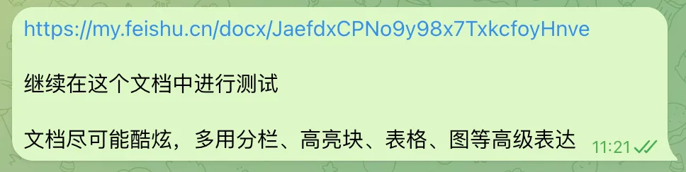 这个document_id,我们直接拼在“https://my.feishu.cn/docx/”后面就行了。当然你也可以让他给你完整的飞书链接
