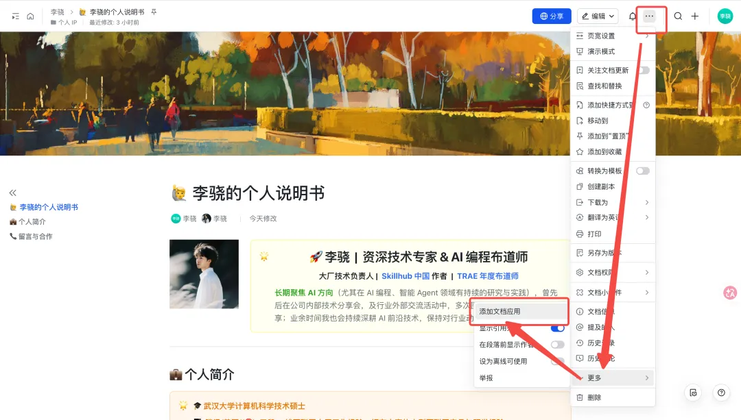 打开文档,「…」→「更多」→「添加文档应用」