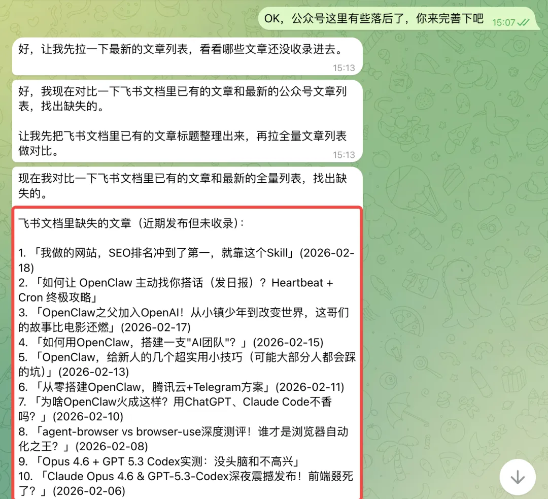 然后再就是需要飞书文档自动更新的场景,交给openclaw也不错💁