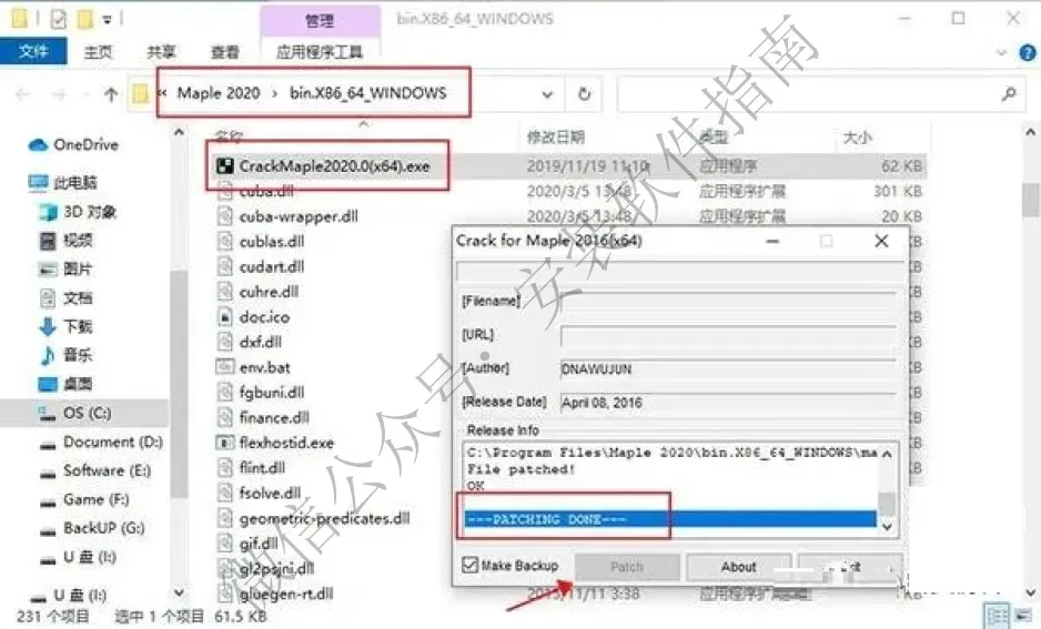 10.将crack文件夹内的CrackMaple2020.0(x64).exe复制到软件安装目录下,然后运行点击patch;默认路径:C:\Program Files\Maple 2020\bin.X86_64_WINDOWS