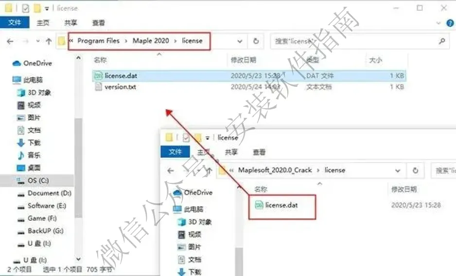 11.然后再将license文件夹内的license.dat复制到软件许可证目录下;默认路径:C:\Program Files\Maple 2020\license
