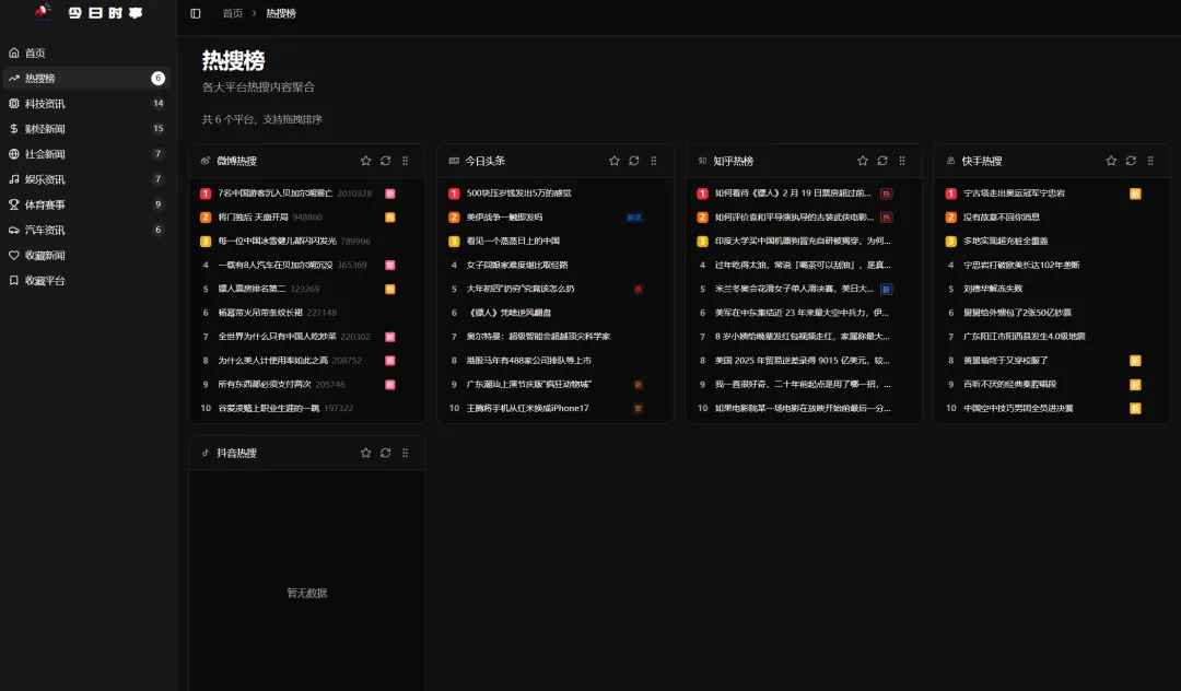 好用的地方:支持 Ctrl+K 快捷搜索,可以快速定位关键词;有明暗主题切换;左侧导航栏支持”收藏新闻”和”收藏平台”功能,意味着你可以只保留自己关心的信源。站点结构清晰,科技(/tech)、财经(/finance)、社会(/social)、体育(/sports)、汽车(/car)、娱乐(/entertainment)、热搜榜(/hot)各有独立页面,分类浏览毫无压力。