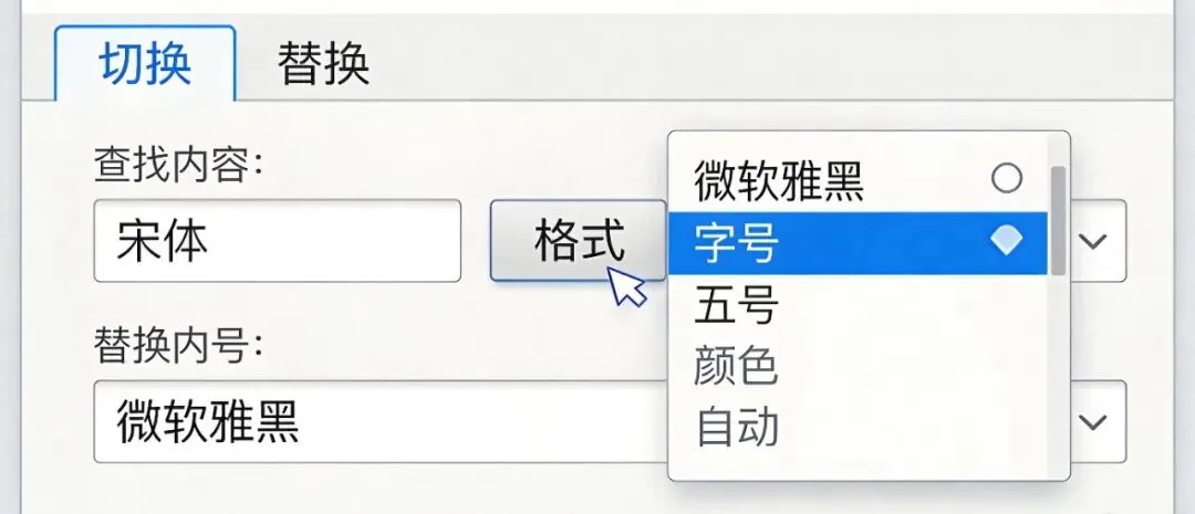 设置目标格式:选择需要被替换的字体格式(如“宋体,五号”)。 -