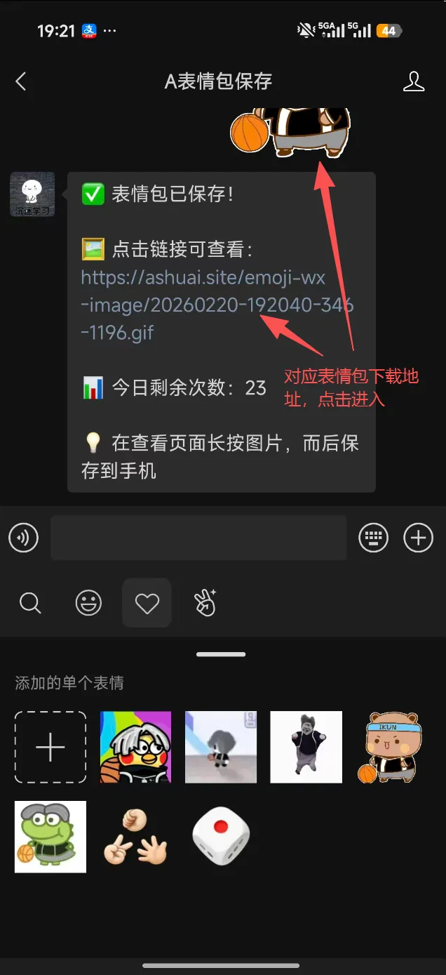 然后,公众号收到表情包以后,会进行处理,大约两秒钟左右,给到用户一个表情包图片下载地址