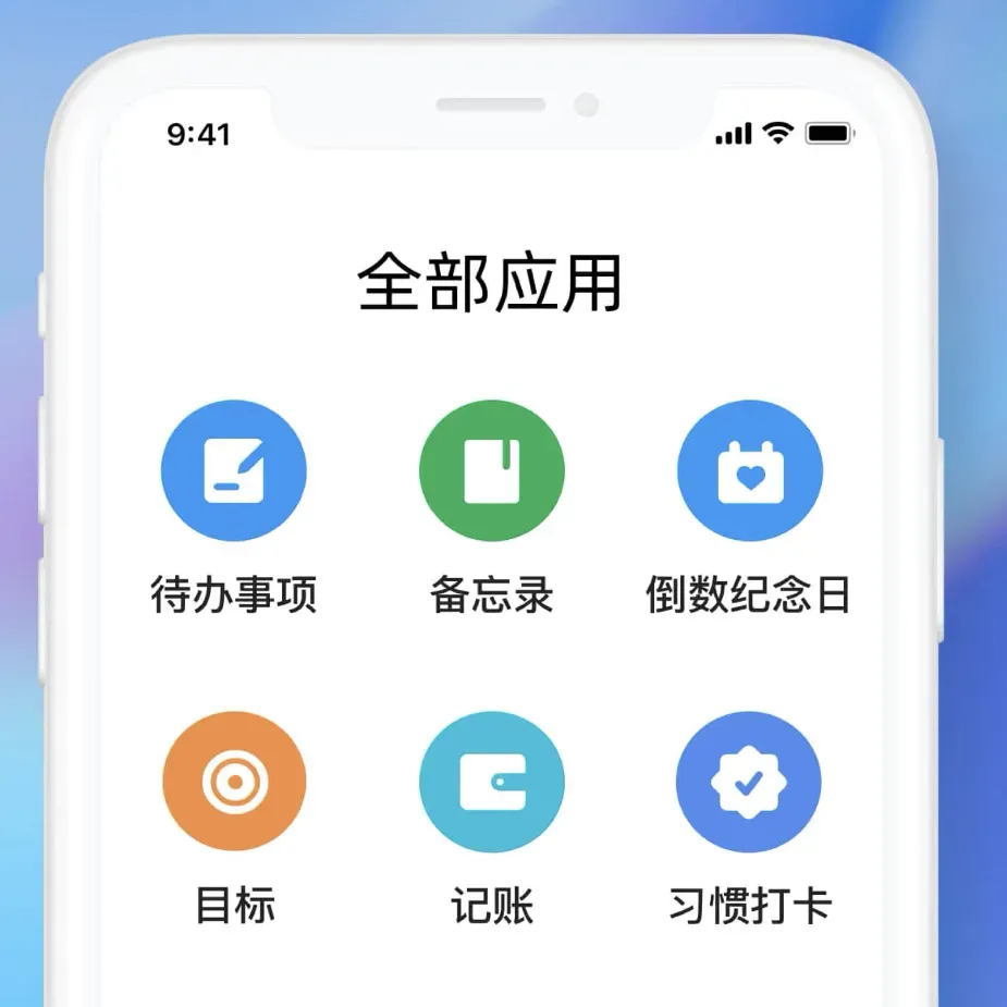 包括18个应用小功能:事项、目标、习惯打卡、倒数纪念日、日记、记账、生理期、番茄专注、读书笔记、备忘录等。