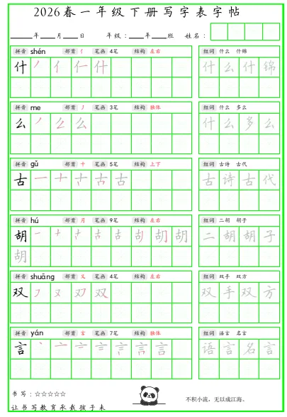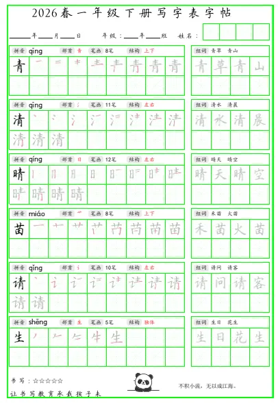 本站文章均为手工撰写未经允许谢绝转载:夜雨聆风 » 写字表组词脱格护眼字帖26年下册 电子版可打印