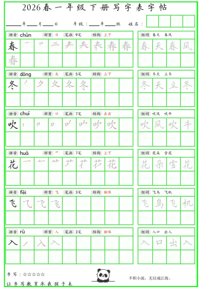 写字表组词脱格护眼字帖26年下册 电子版可打印