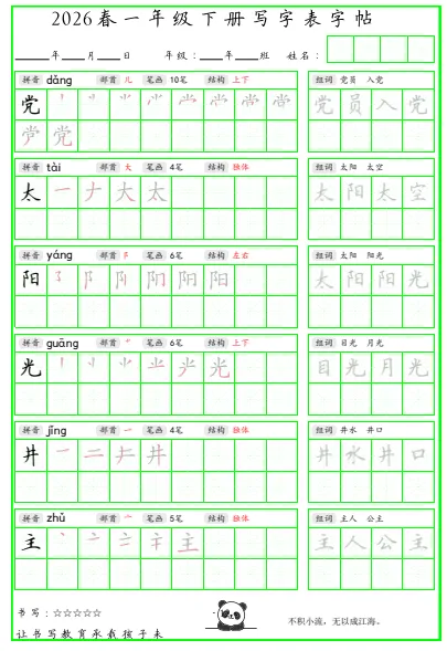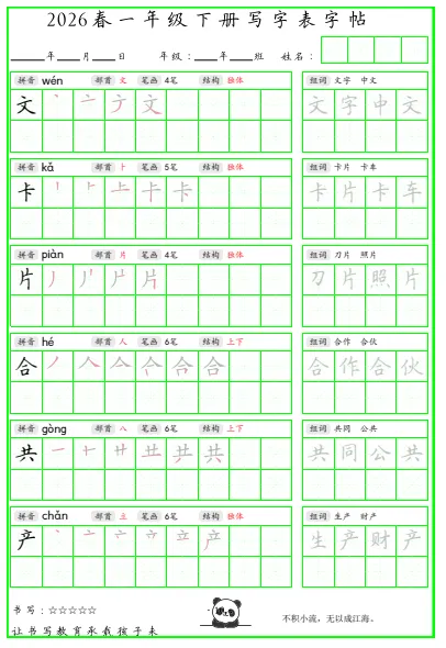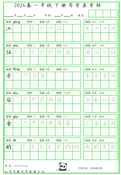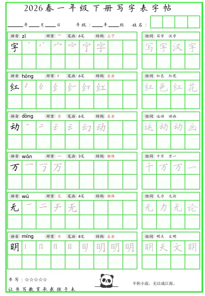 今天给大家分享的是写字表组词脱格护眼字帖26年下册