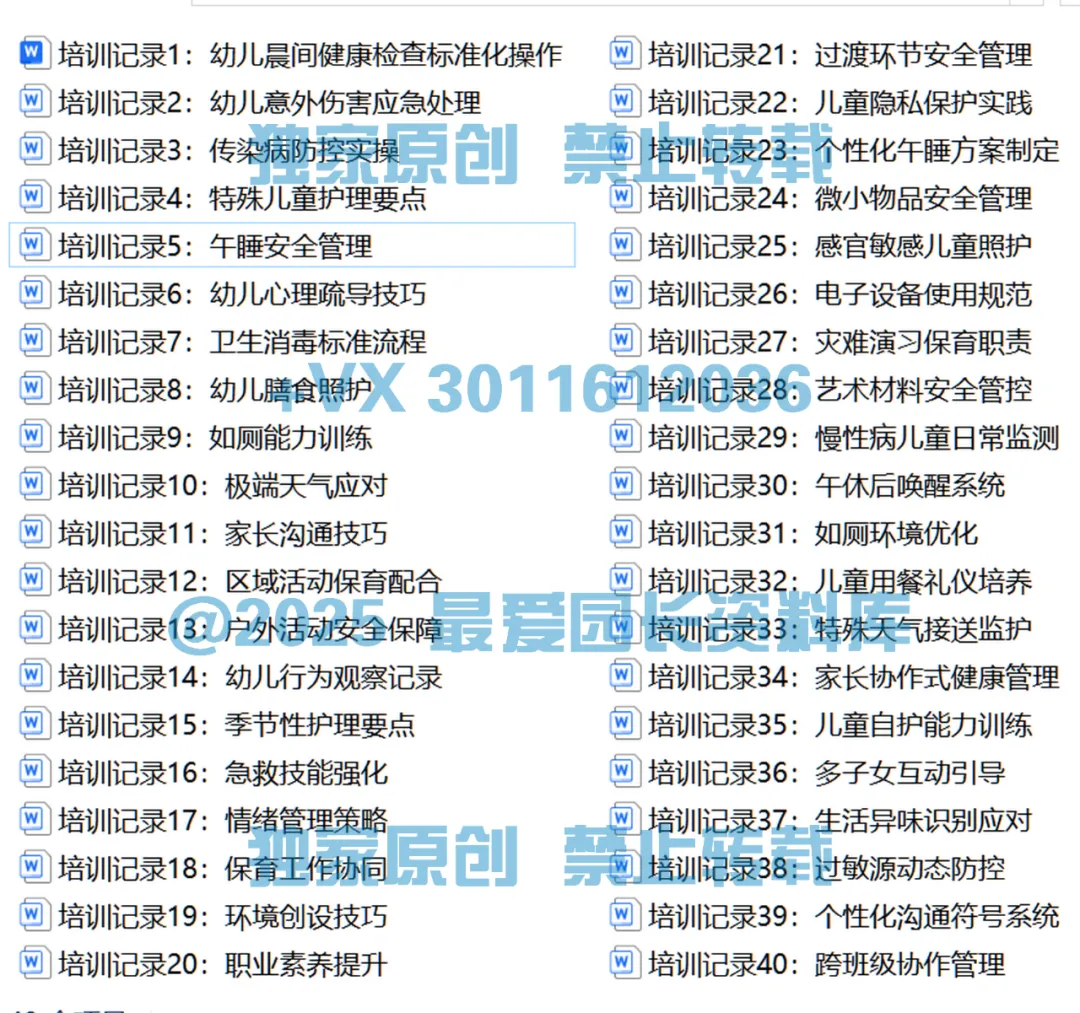 【培训电子版】25-26全学年幼儿园保育员培训记录40次 word电子版, 共40份, 目录内容已经排版好。 可以直接打印。 详细内容请观看文档录制的视频 幼儿园保育员培训记录40次 培训记录1: 幼儿晨间健康检查标准化操作 培训记录2: 幼儿意外伤害应急处理 培训记录3: 传染病防控实操 培训记录4: 特殊儿童护理要点 培训记录5: 午睡安全管理