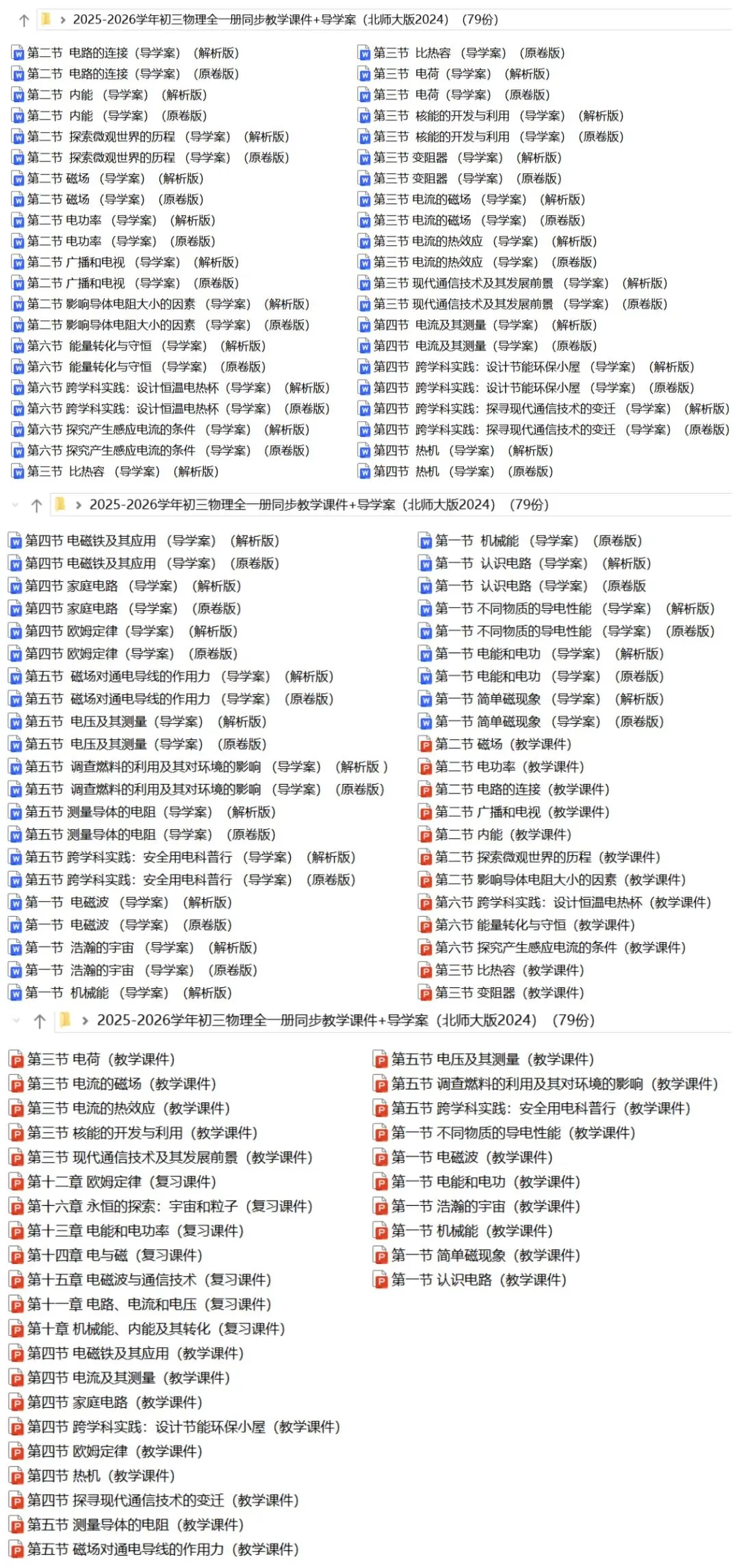 2026年初三物理全一册北师大版:同步导学案+教学课件79份含答案解析 | 完整文档可下载打印 点击进入九年级物理全一册北师大版合集【持续更新中……】 2025-2026学年 九年级物理北师大版全一册 同步导学案+教学课件 习题+课件 79份含答案解析 所有文档A4word版+ppt版 教师版+学生版 完整电子版文档可下载打印 无水印、可编辑、可修改 完整版目录及部分内容截图如下 下载方式见文末 以下公众号👇 专注高中优质学习资料 欢迎点击关注 获取更多学习资源