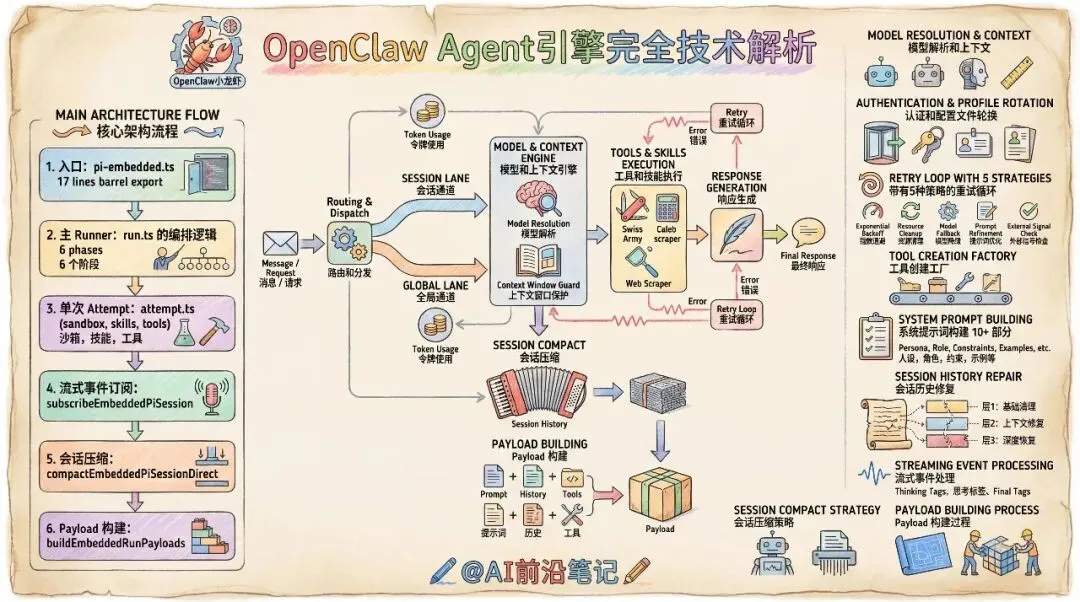 大年初四,今天继续OpenClaw源码解读——Agent 引擎。这部分是整个OpenClaw项目的核心中的核心,甚至可以单独拿来使用。