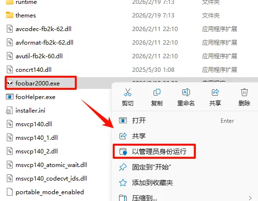2.打开刚刚解压的文件夹,鼠标右键点击“foobar2000.exe”选择“以管理员身份运行“