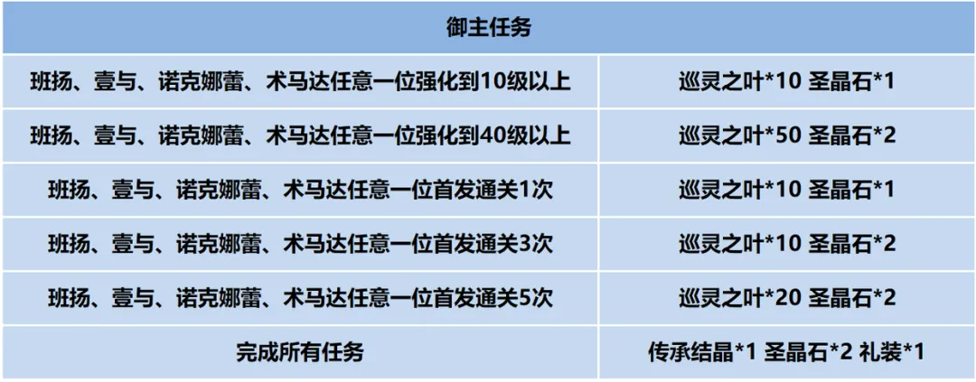 活动期间开启限时御主任务,任务内容为本期4位从者任意一位等级强化到40级,编入本期任意一位从者作为首发成员完成5次任意关卡。