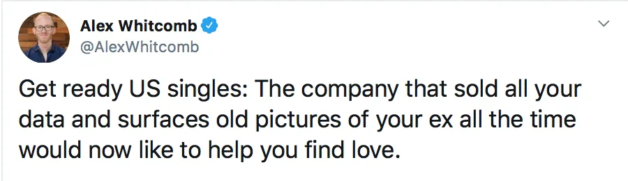 Get ready US singles: The company that sold all your data and surfaces old pictures of your ex all the time would now like to help you find love.