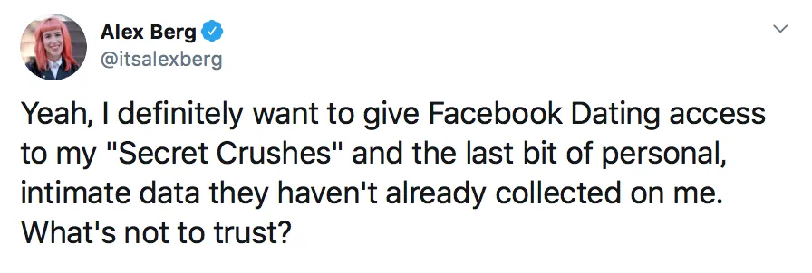 Yeah, I definitely want to give Facebook Dating access to my “Secret Crushes” and the last bit of personal, intimate data they haven’t already collected on me. What’s not to trust?