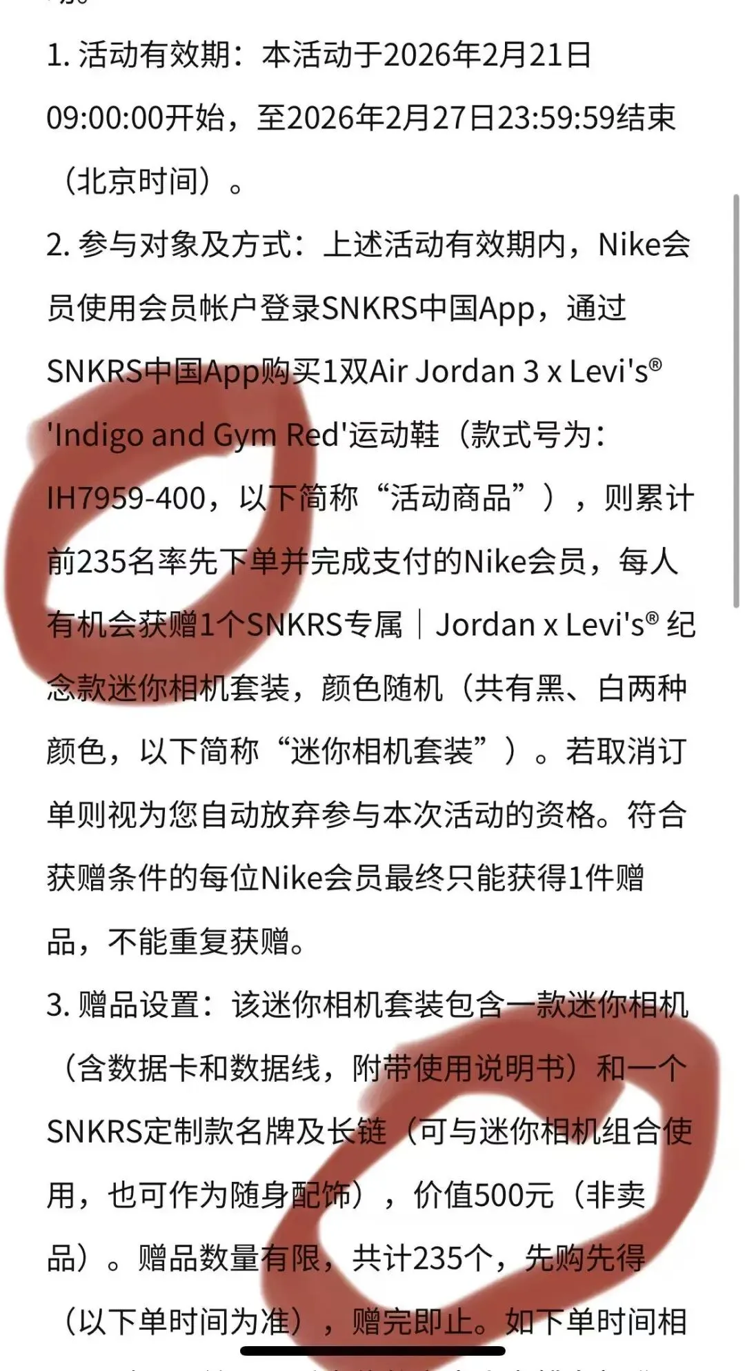 Levi’s x Air Jordan 3″Black”/”Rigid”两款配色(丹宁原牛、黑色)联名球鞋正在如火如荼的发售中这次联名丢掉了AJ3经典的大象爆裂纹元素也失去了AJ3原本的特色但这次不谈球鞋,萝卜青菜各有所爱只聊SNKRS明天发售才会给的赠品因为这个赠品才打算抢一手并不太喜欢的Levi’s x Air Jordan 3 “Rigid”限量235台,只有前235人付款成功并确认收货的朋友才会得到的带有SNKRS品牌LOGO价值500元的“迷你相机”套装一台(含数据卡、数据线、SNKRS定制的名牌及长链)购买球鞋送赠品的活动位置,不往下拉还真不容易发现说是赠品但质感、包装绝对不差黑色、白色的金属质地外壳,小巧便捷的设计还能戴脖子上,挂包上当饰品最主要还能照相,即使不喜欢这鞋确实心动,冲这赠品也得冲一把但眼尖的老哥不止我一个万一没拿下怎么办?提前做好准备工作,看看有没有平替吧!这一看不要紧,您猜怎么蜇?通过放大,物品图片搜索在拼刀刀上发现了一样的东西多种配色可选,且价格仅需500元的10%功能确实强大,还能屏幕翻盖外壳是金属质地的塑料制品,也不是想象中的金属上次写推文,我说用高透光看labubu隐藏,有人说我是买手电筒的这次不会又说我是卖相机的吧,重申一下不卖任何东西如果卖东西,也会大大方方的挂链接最主要是拼刀刀上的相机数据比SNKRS还要好一些SNKRS的迷你相机是1280×720 f=2.2mmF2. 4720P的高清 2.2mm的焦距 2.4的光圈刀刀上是1920x1080P的超高清 2.8的光圈高下立判,最主要是SNKRS官方给出的500元这价格里至少得有450块是SNKRS Logo的品牌溢价了说真的,看到这就有点倦了突然就感觉鸡肋了拍景物够呛,拍人像更不行的两难境地立马就失去了明天抢一手的动力限量235台,价值500块的迷你相机我放弃了喜欢收集这些带logo的潮流商品还不差钱的的朋友们可以上一上了喜欢这双Levi’s x Air Jordan 3″Rigid”的朋友祝明天好运~明天“初五” 大家好好迎财神~