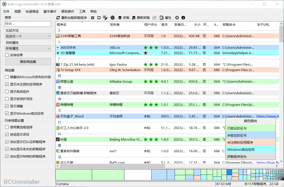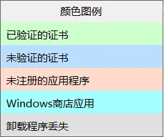 我们可以看到所有已安装的软件,这些软件根据“验证的证书”、“未验证的证书”、“未注册的应用程序”、“Windows商店应用”和“卸载程序丢失”几个方面,用颜色进行标注,非常方便大家进行查看!