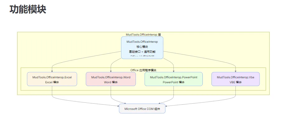 MudTools.OfficeInterop 并非简单地把 Application 包一层,而是重新设计了一套面向 .NET 开发者的 API 体系。其核心思想可概括为四点: