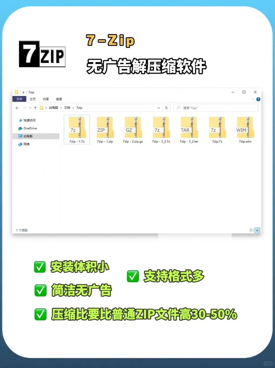 7-Zip + Everything文件压缩和搜索是日常电脑使用中的高频操作。7-Zip作为一款无广告的压缩软件,不仅体积小巧、支持格式多,其压缩率更是比普通ZIP文件高30-50%,能帮你节省大量存储空间。而Everything则是文件搜索领域的革命性工具,它能基于文件名实时快速定位文件和文件夹,即使面对数百万文件也能秒级响应。系统自带的搜索往往慢得让人抓狂,而Everything却让文件查找变得如呼吸般自然。这对组合让你在文件管理上事半功倍,从此告别“文件去哪儿了”的困扰。
