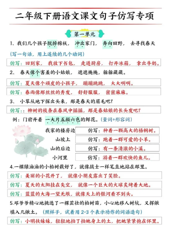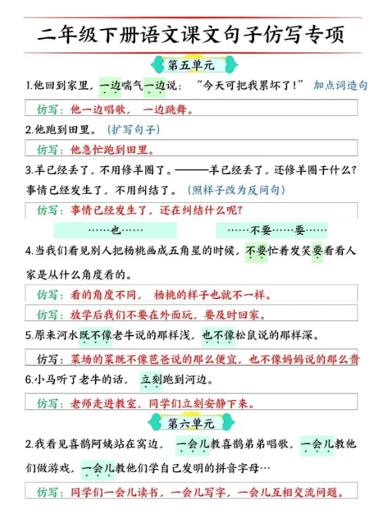 26(新版)二下语文【必考仿写句子】读背版共10页(完整版),电子版高清可下载可打印。因篇幅有限,仅展示部分内容。有需要的家长快给孩子领取一份,让孩子读一读,背一背!