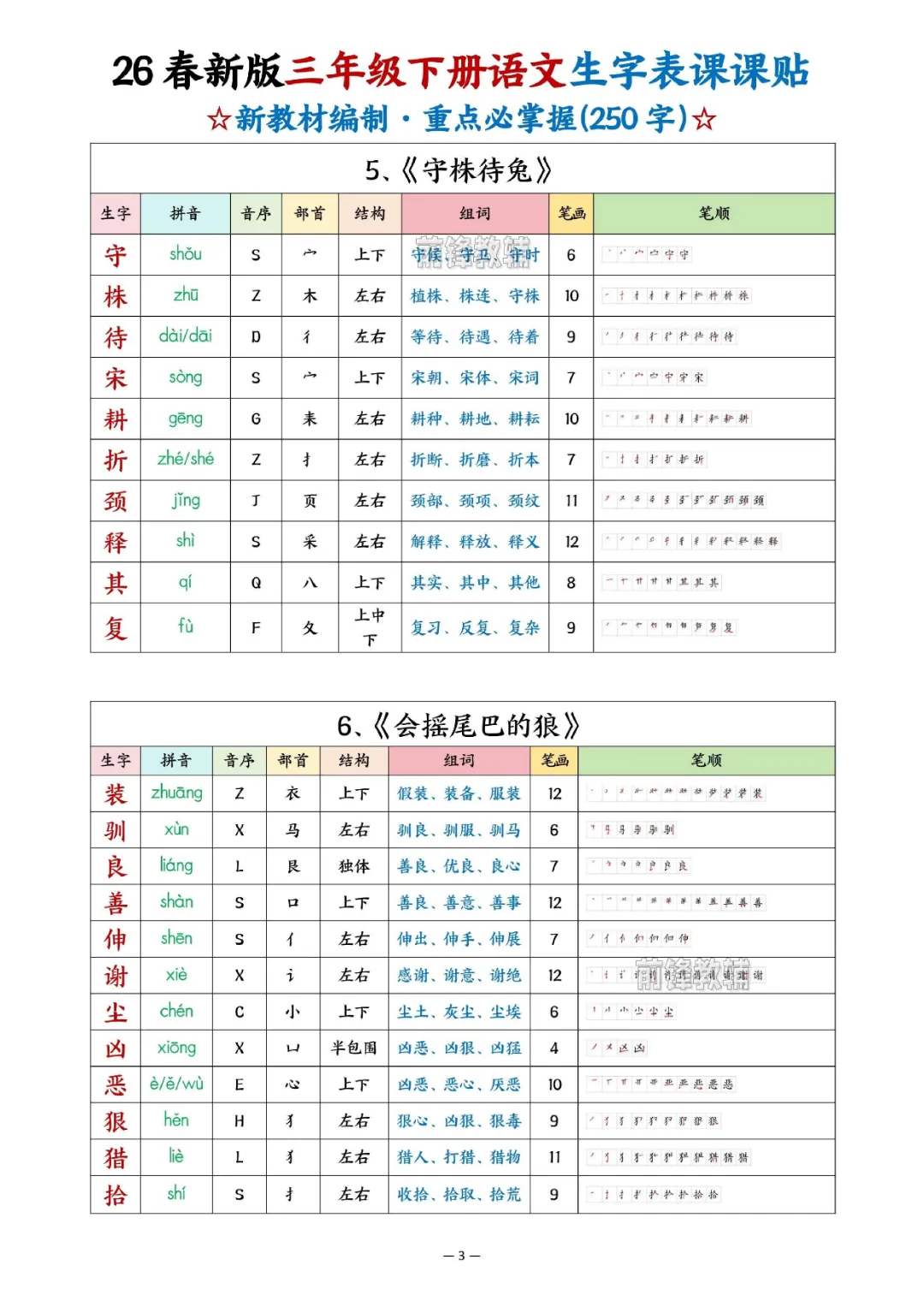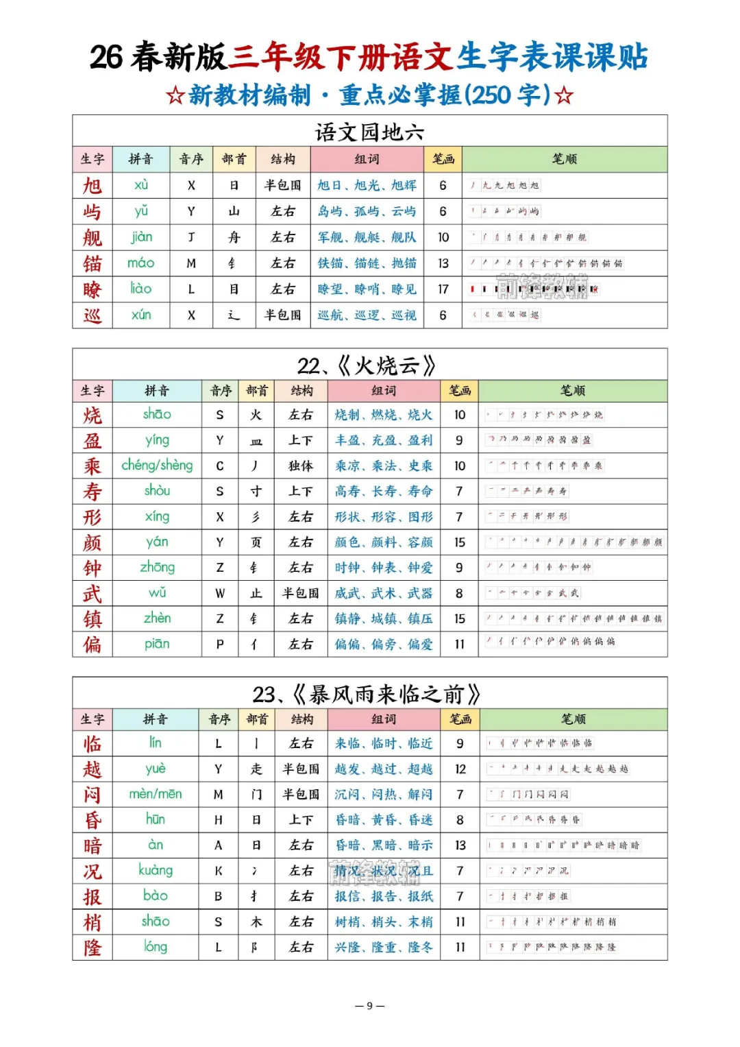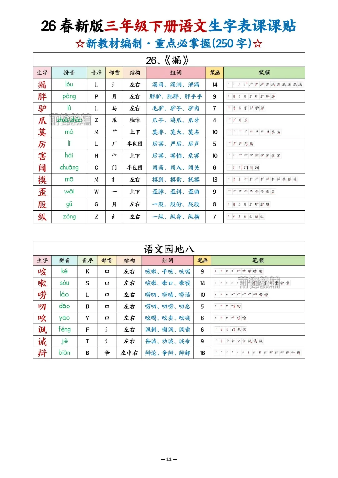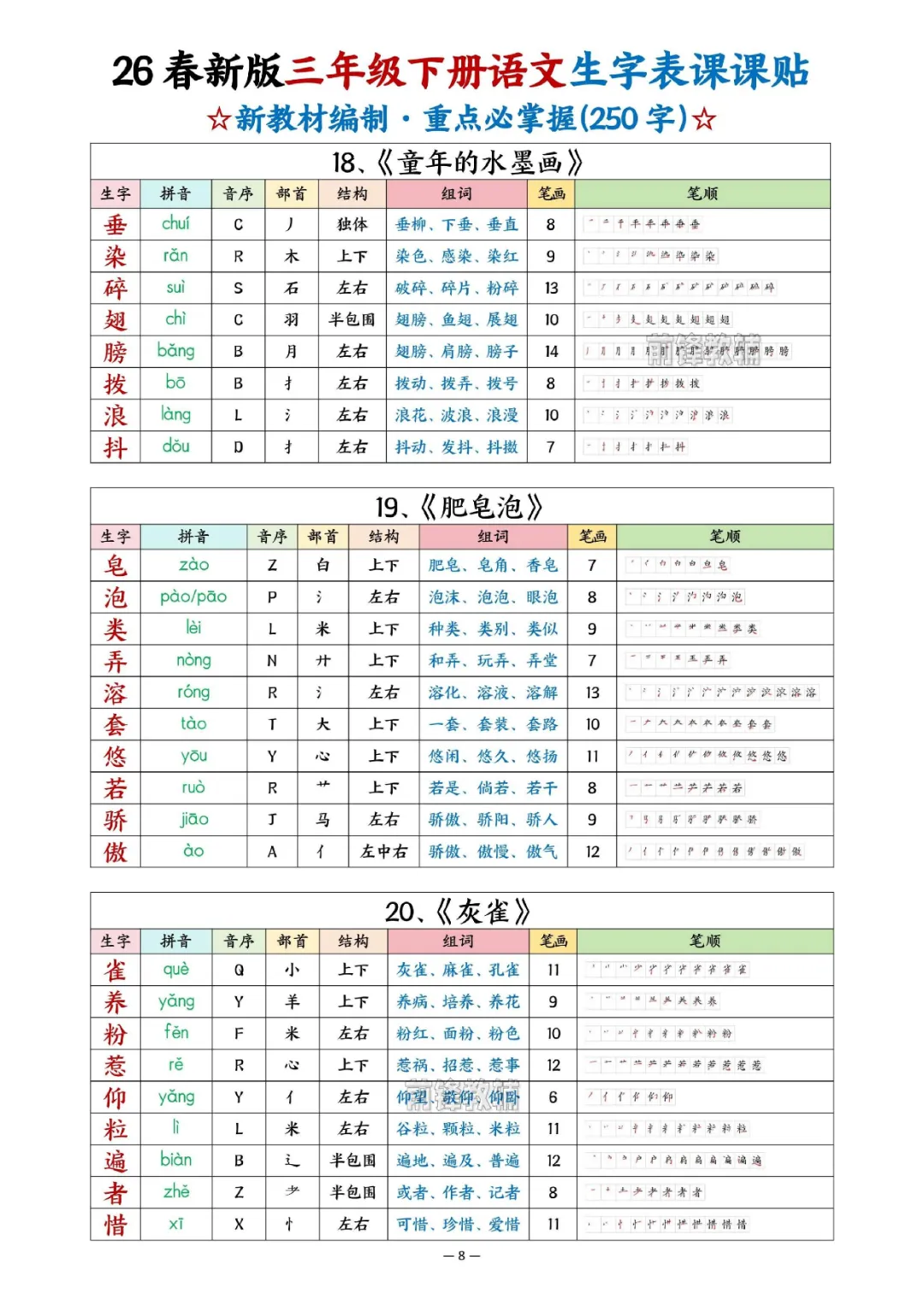 2026年三年级下册语文生字表课课贴|电子版可打印