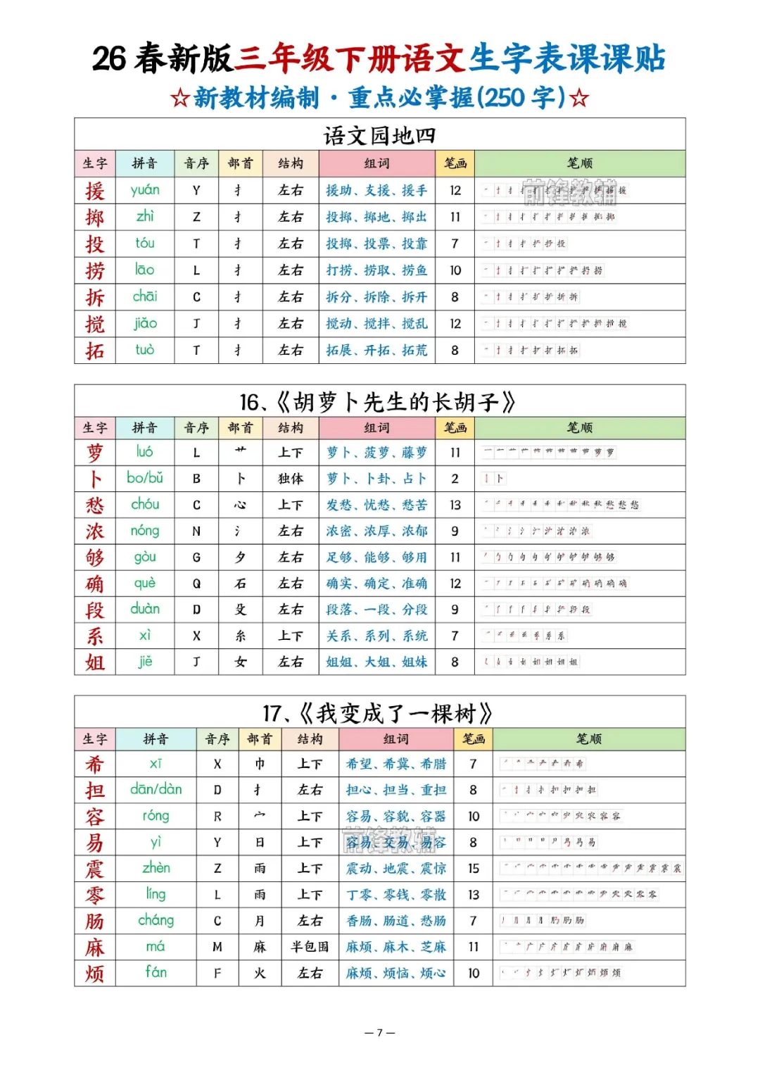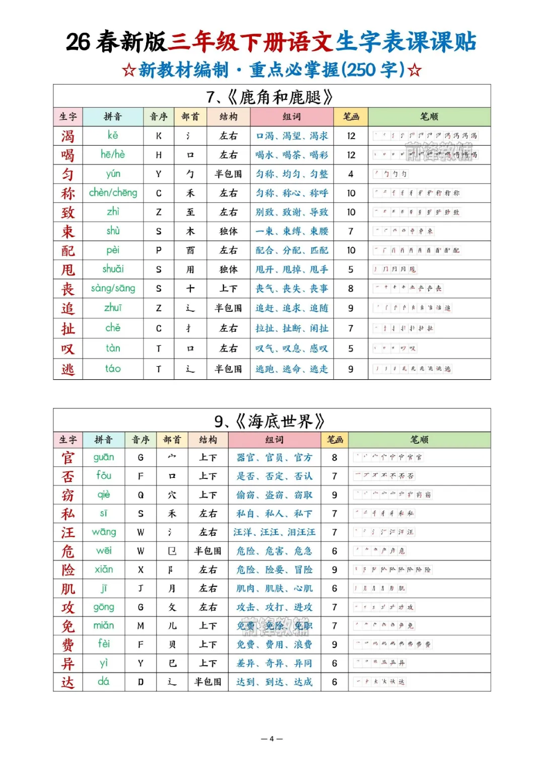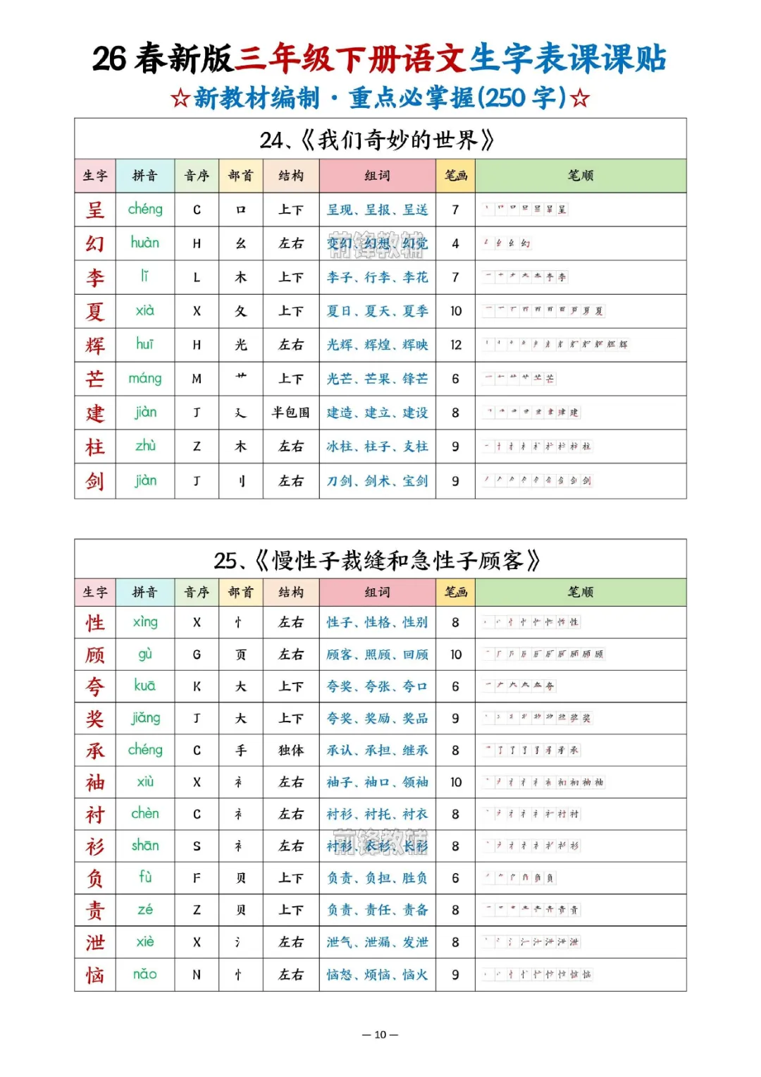 2026年三年级下册语文生字表课课贴|电子版可打印