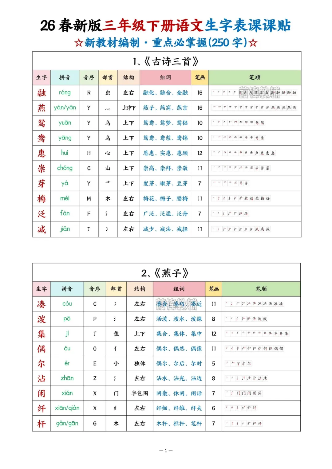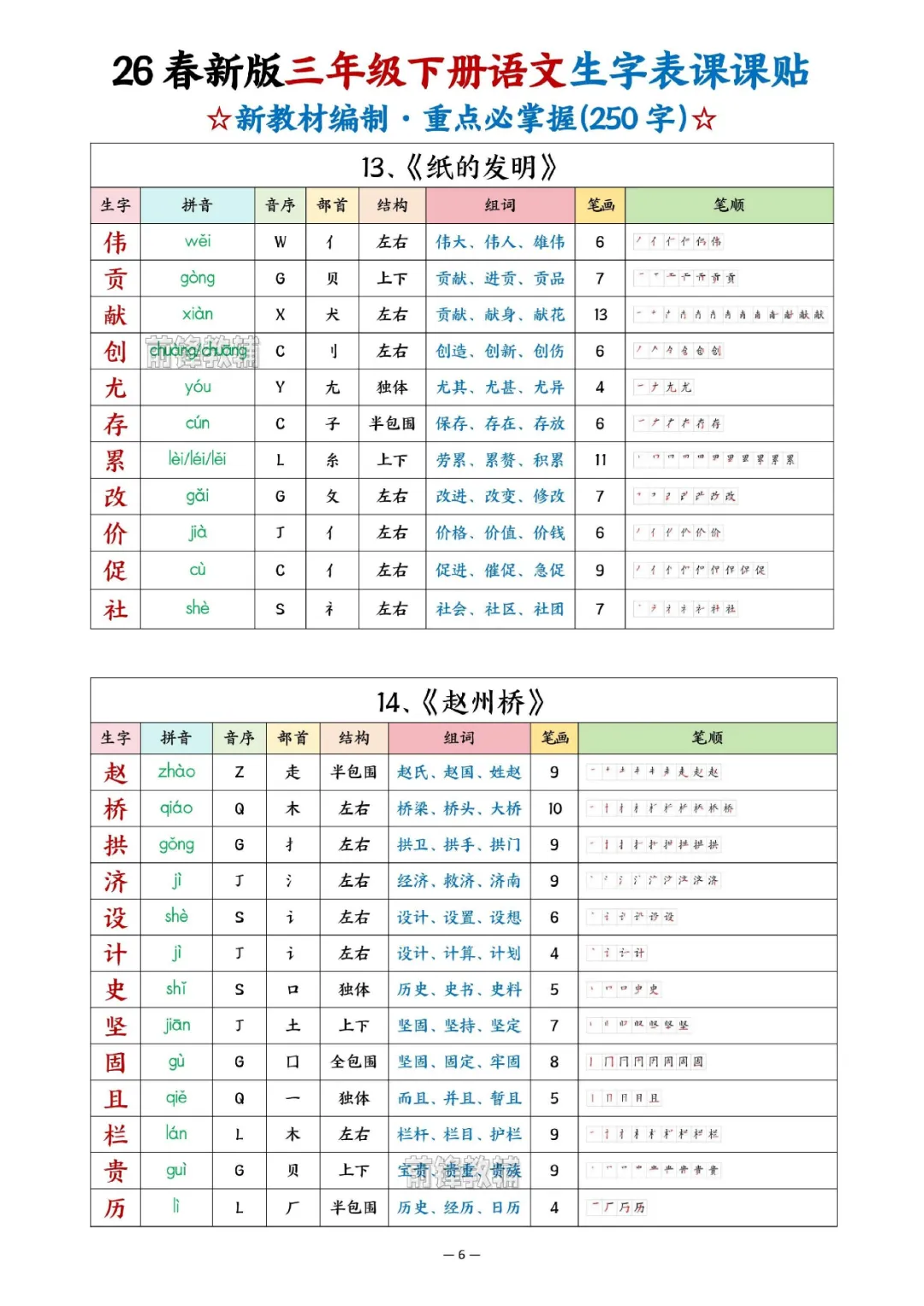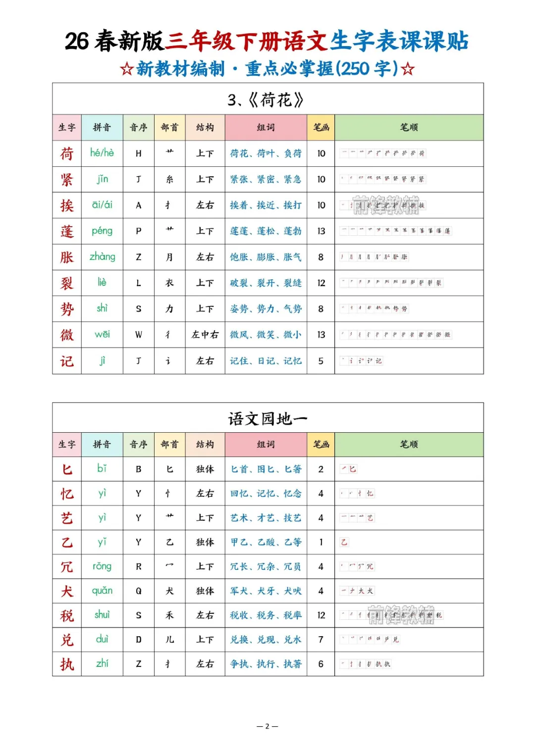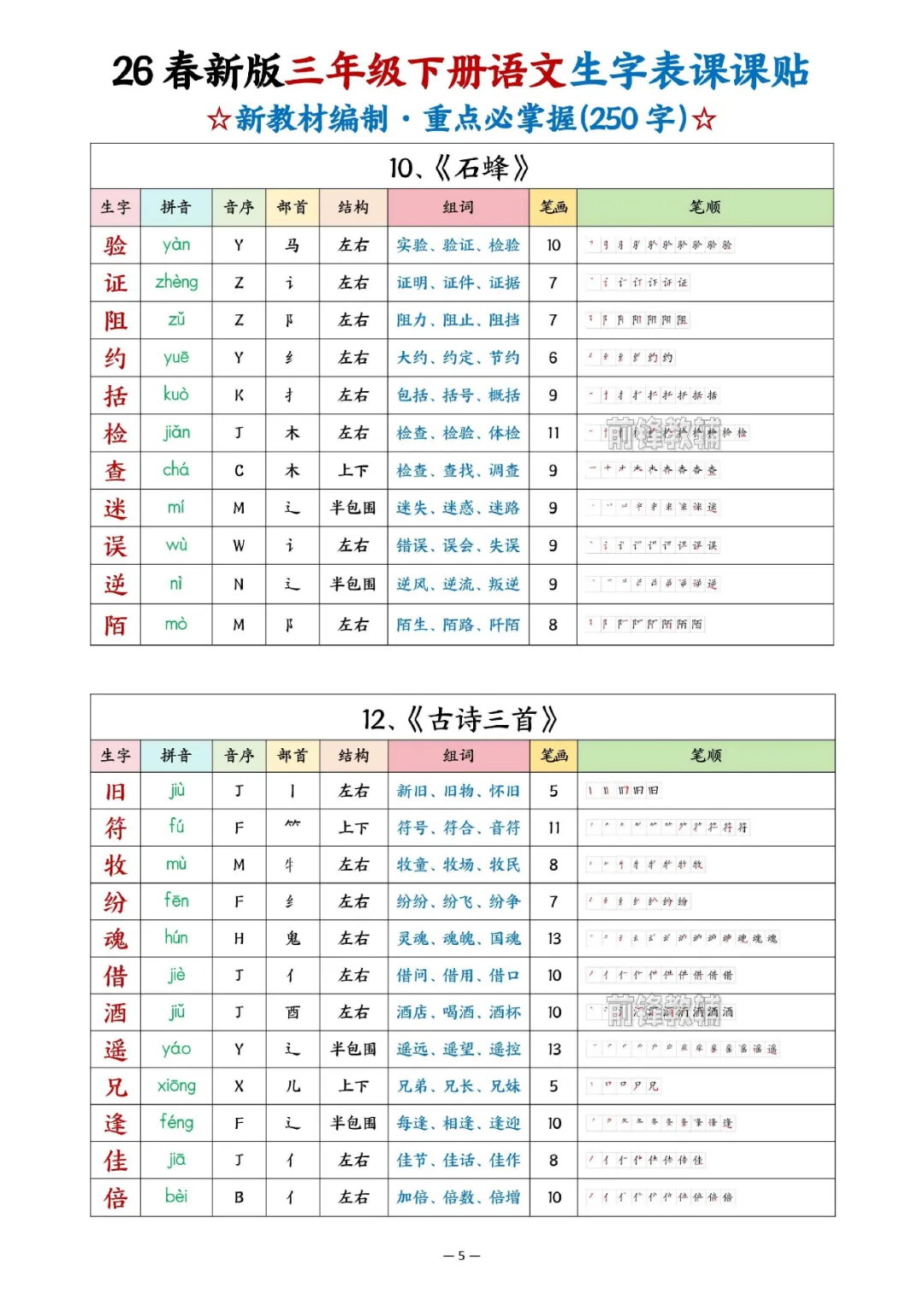 2026年三年级下册语文生字表课课贴|电子版可打印