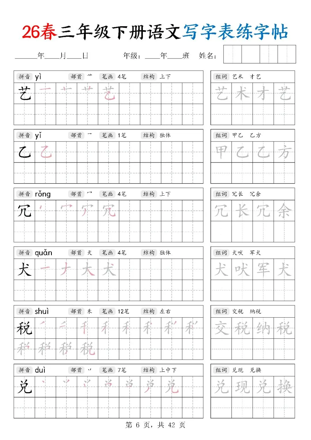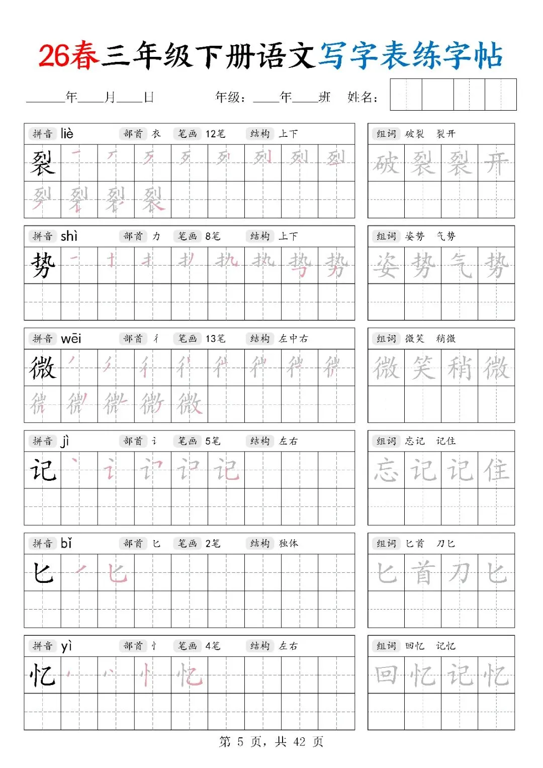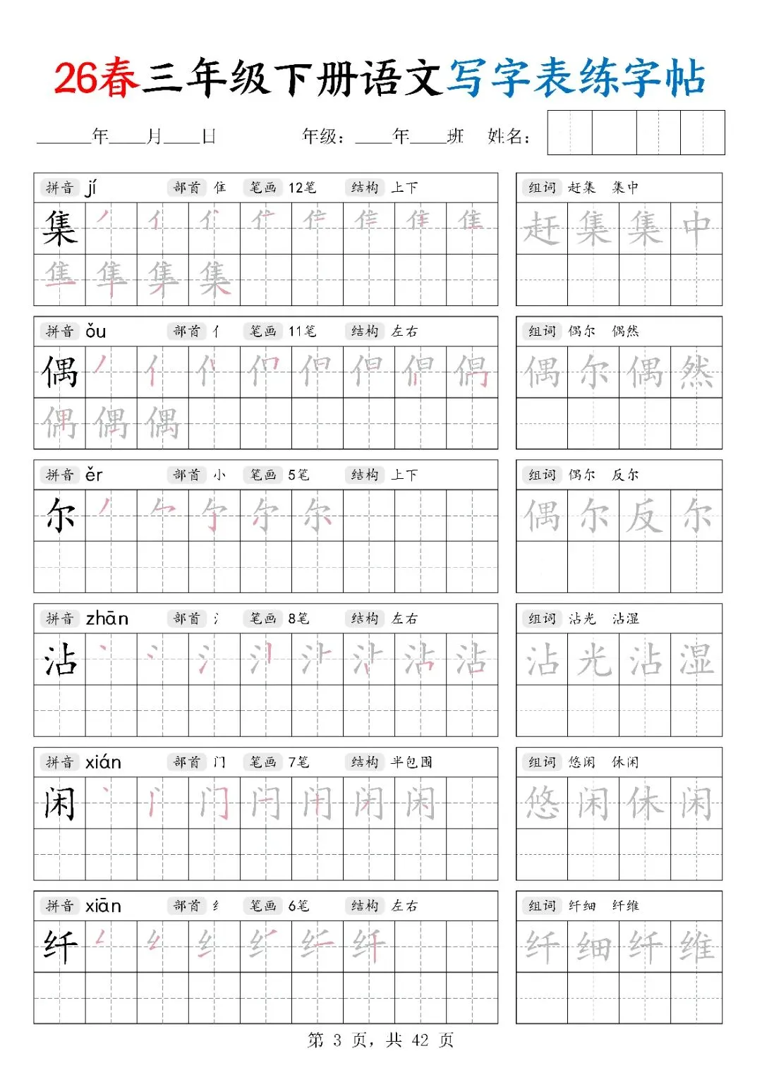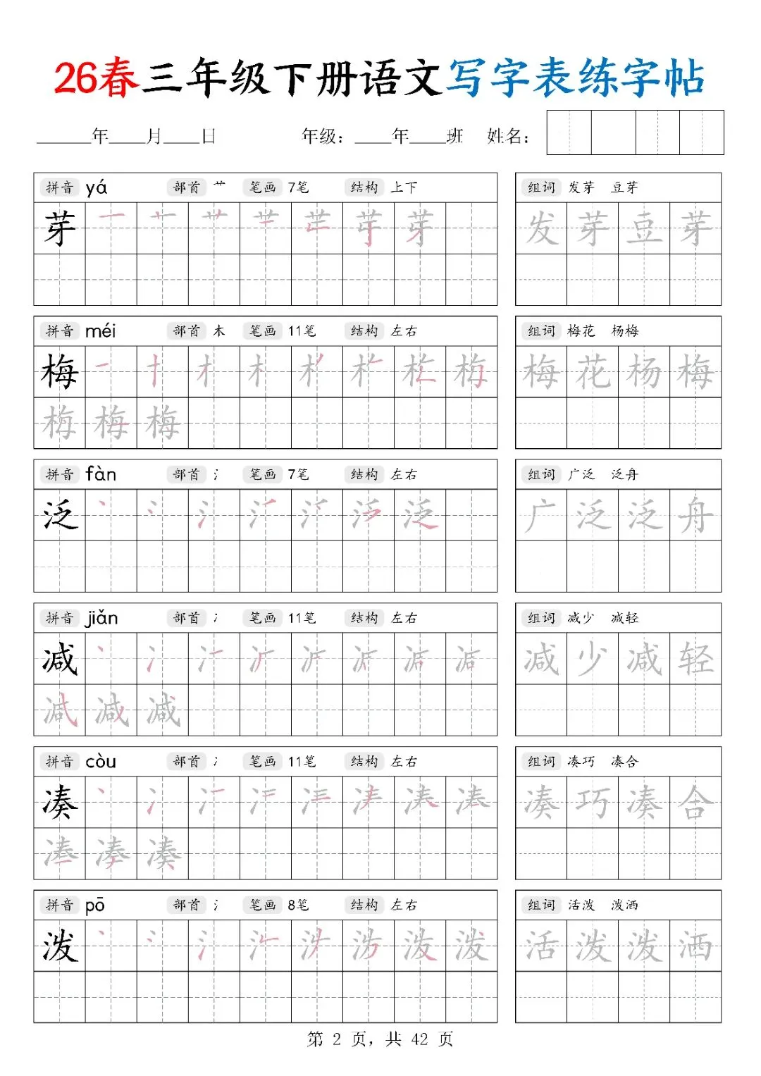 2026春《三年级下册语文写字表练字帖》电子版可打印