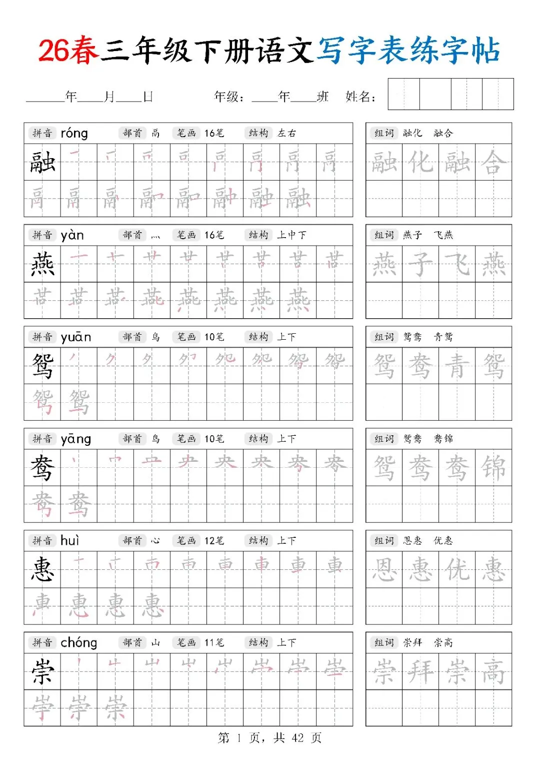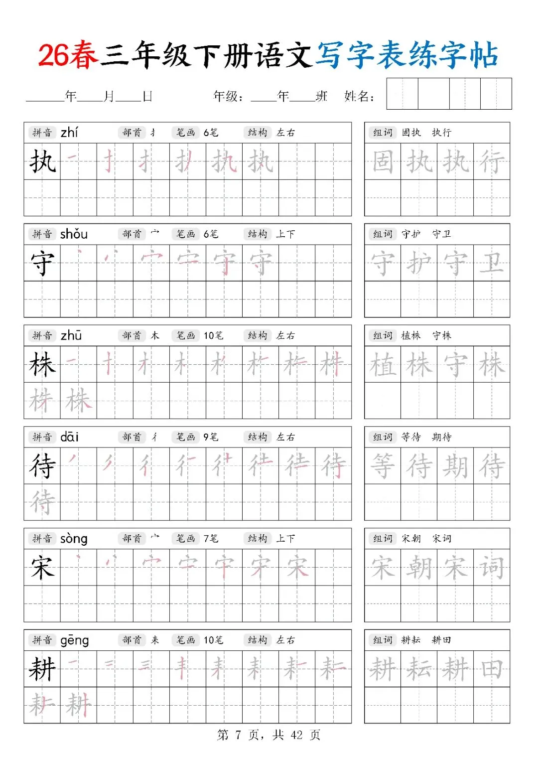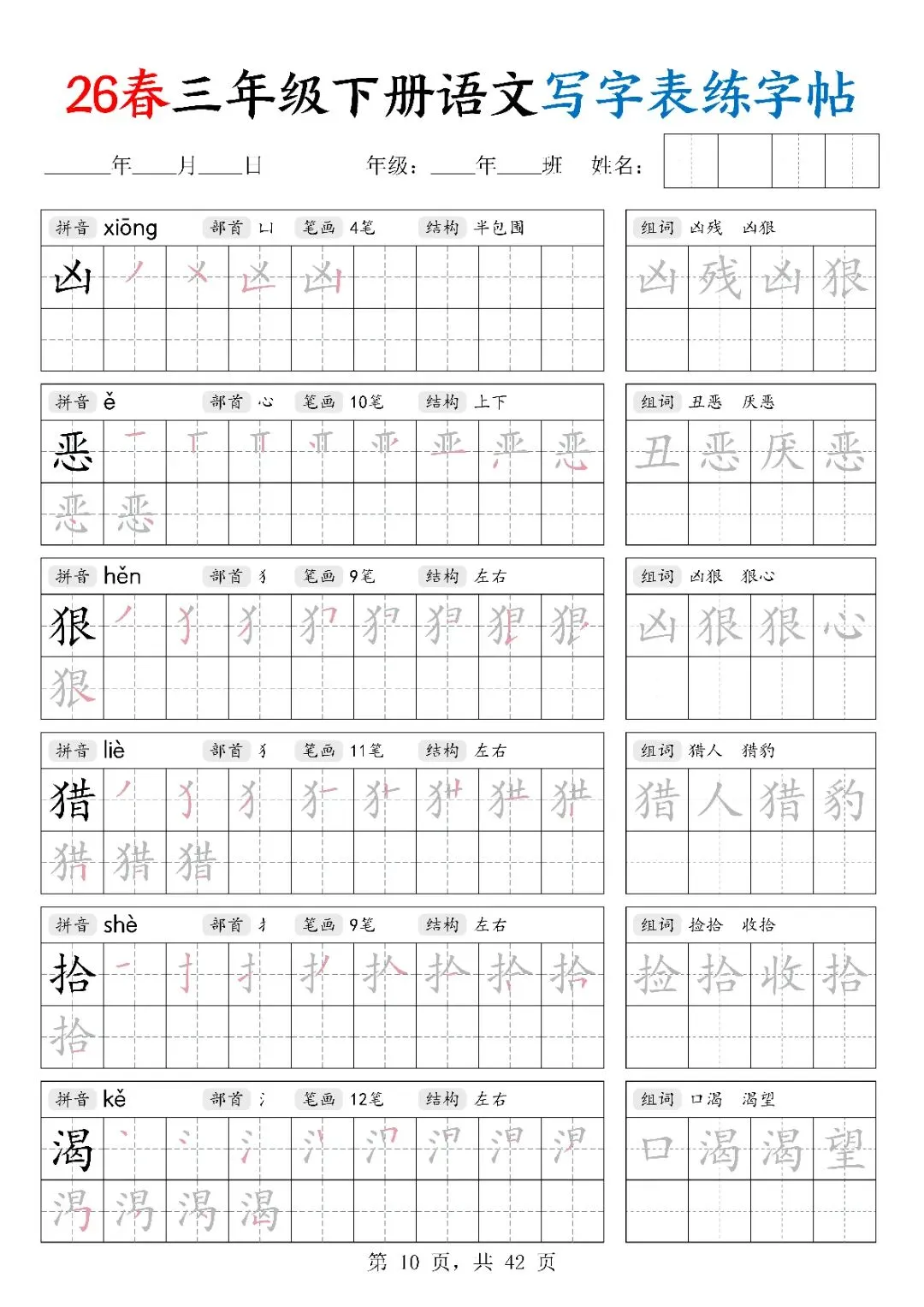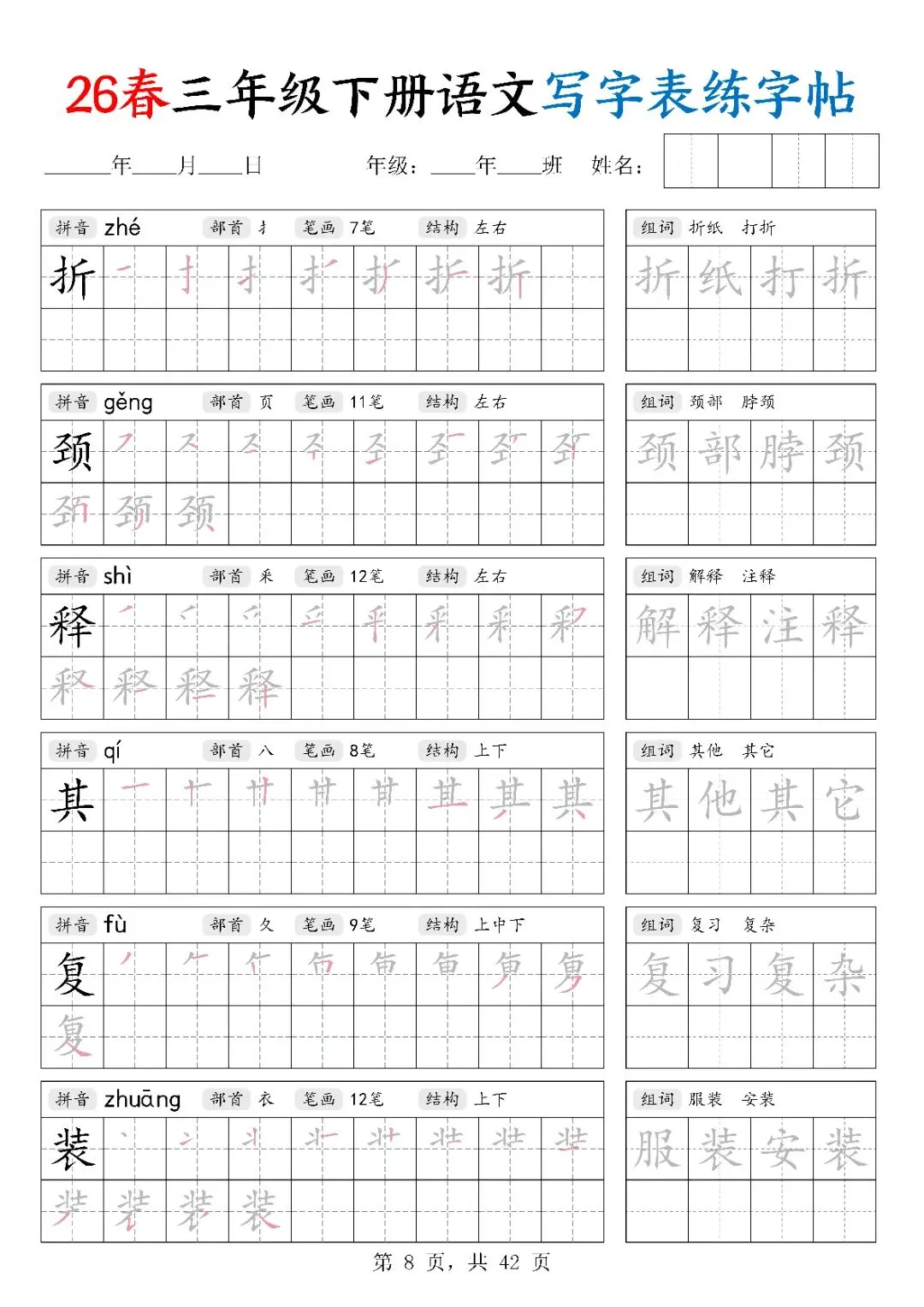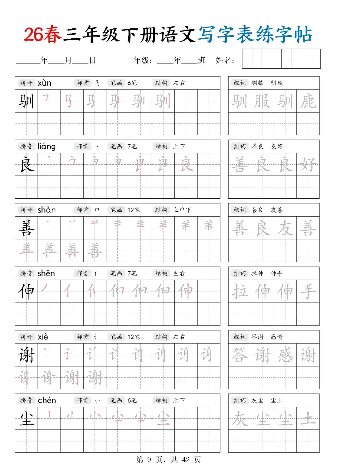 2026春《三年级下册语文写字表练字帖》电子版可打印