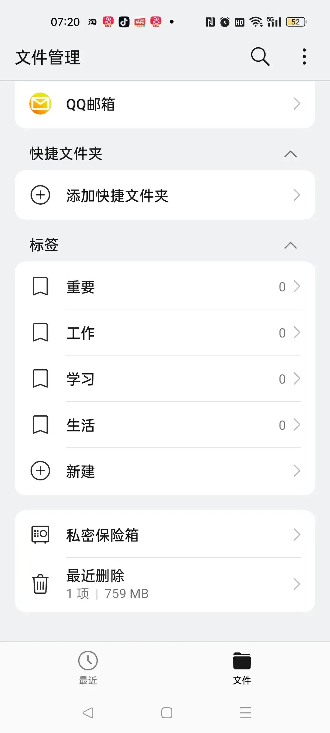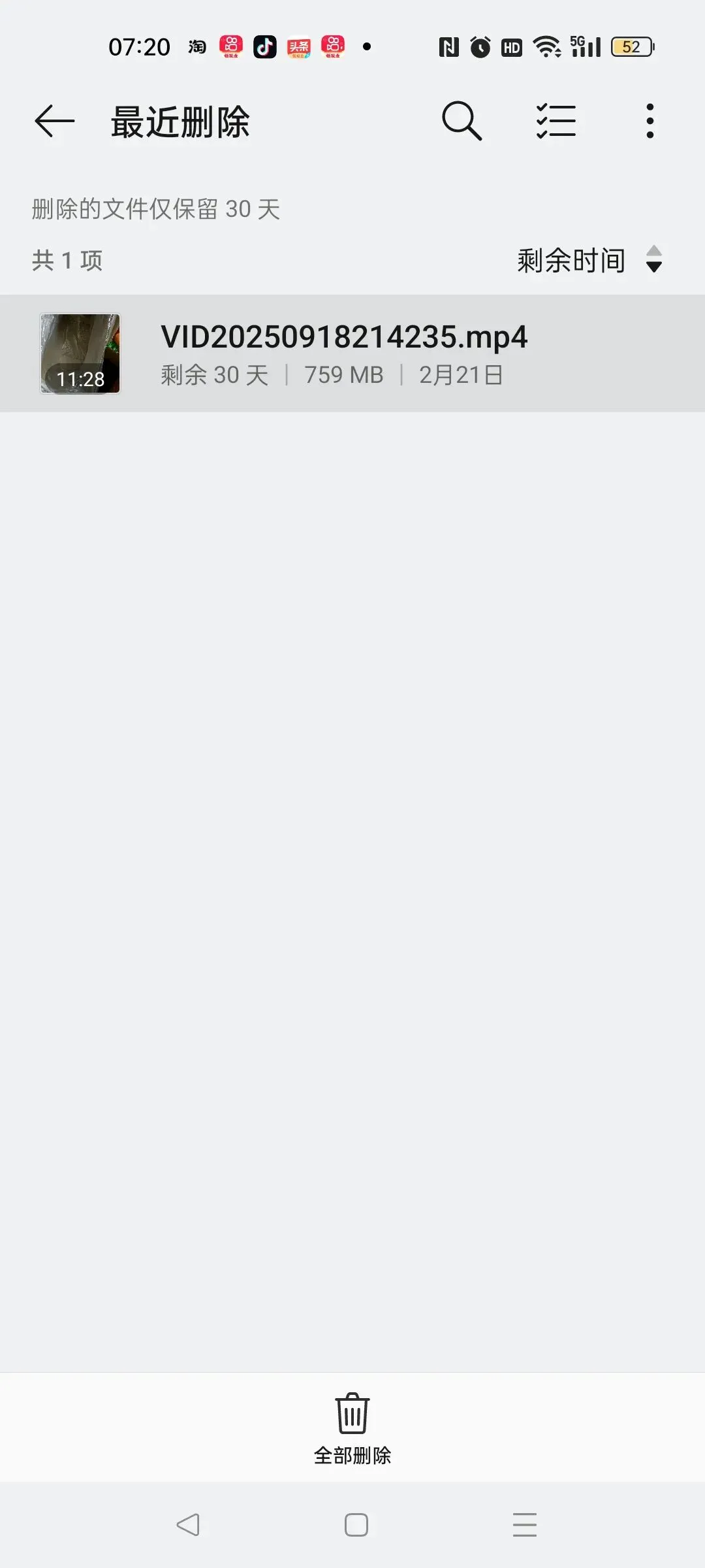 今天看手机的已用空间很大了,就删除了一些视频,没想到一看已用空间没有减少,有点懵了,重启还是这样,百度了一下,估计是没删干净,在文件管理里面往下一拉,看到了一个最近删除的地方,删除的视频在这里都能看到,点进去,可以进行恢复,或者点击进行全部删除,这样可算删干净了,已用空间才看到减少了!!
