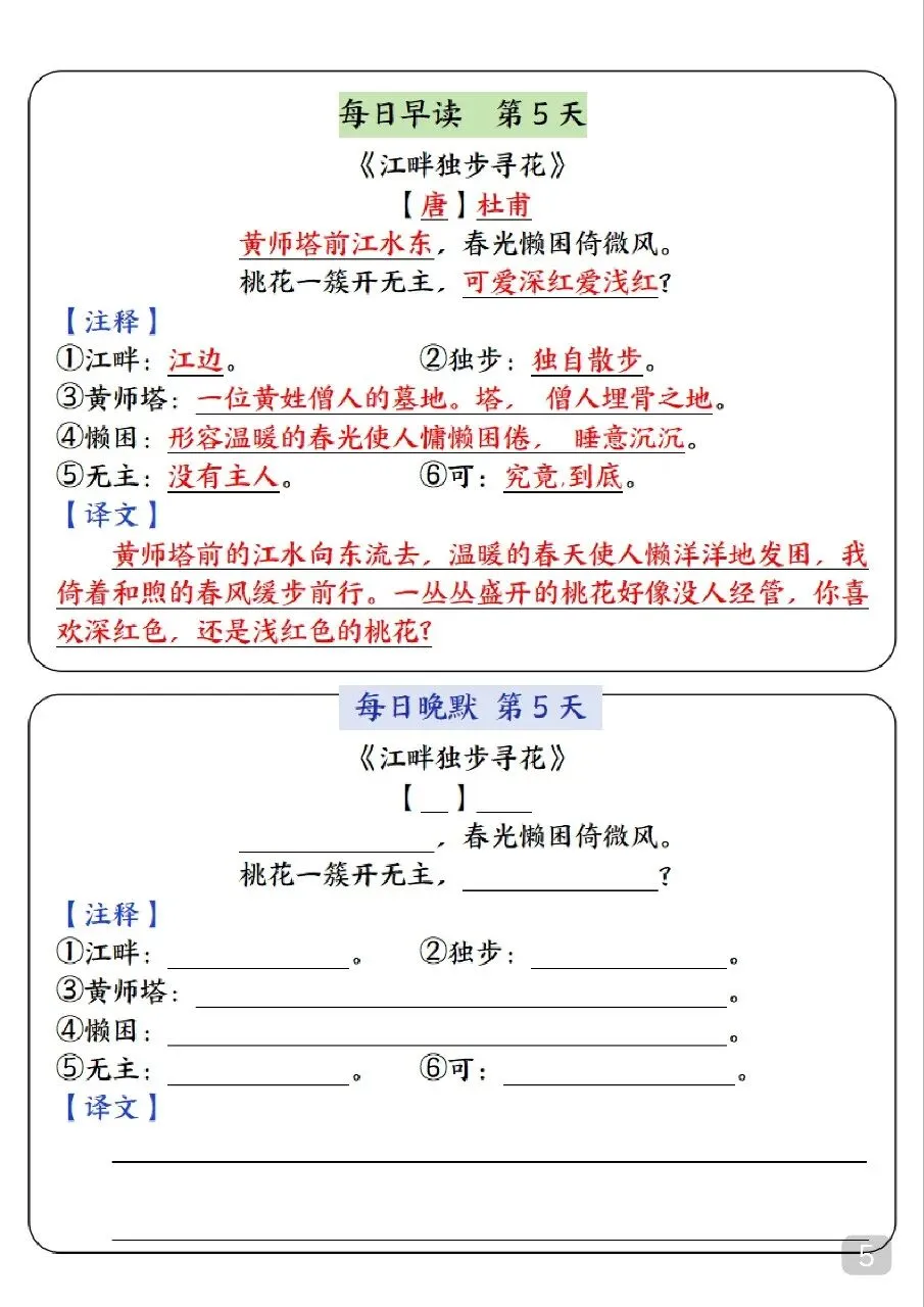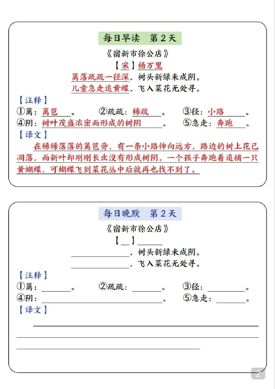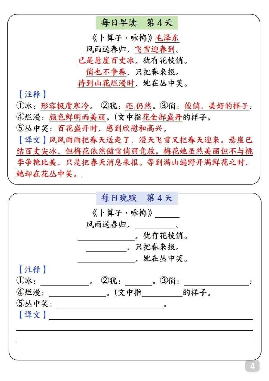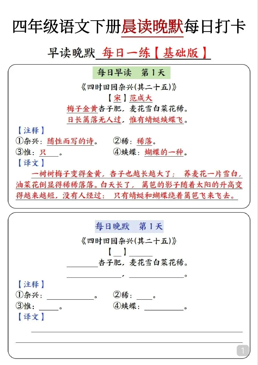 四年级(下)语文 晨读晚默每日打卡.pdf 篇幅有限,无法全部展示。 请按照文末方式领取,无门槛永久免费,欢迎转发,帮助更多有需要的人~ 温馨提示: 文末有完整电子版领取方式! 领取完整电子版: ①:点一点右下角的“👍”和“❤️” ②:在公众号对话框中回复“资料1059”