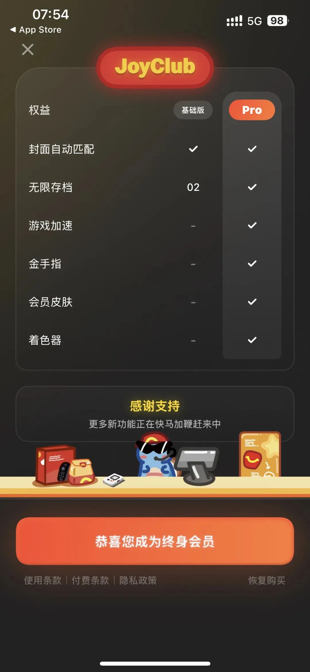 《JOY》一款为热爱而生的多平台游戏模拟器,目前可以免费获取终身会员,打开软件点击顶部Pro进入内购,底部终身会员显示0即可免费获取。