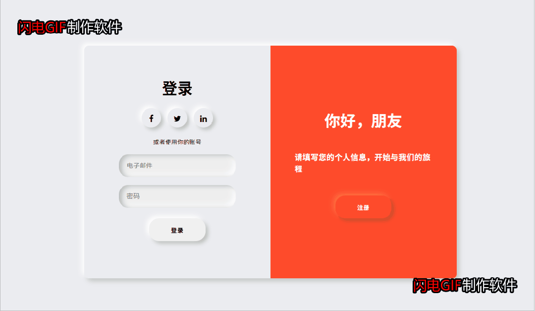 @import url("https://cdnjs.cloudflare.com/ajax/libs/font-awesome/4.7.0/css/font-awesome.css");* {box-sizing: border-box;}body {font-family: "Montserrat", sans-serif;margin: 0;padding: 0;}.wrapper {width: 100%;height: 100vh;display: flex;justify-content: center;align-items: center;background: #ebecf0;overflow: hidden;}.container {border-radius: 10px;box-shadow: -5px -5px 10px #fff, 5px 5px 10px #babebc;position: absolute;width: 768px;min-height: 480px;overflow: hidden;}form {background: #ebecf0;display: flex;flex-direction: column;padding: 0 50px;height: 100%;justify-content: center;align-items: center;}form input {background: #eee;padding: 16px;margin: 8px 0;width: 85%;border: 0;outline: none;border-radius: 20px;box-shadow: inset 7px 2px 10px #babebc, inset -5px -5px 12px #fff;}button {border-radius: 20px;border: none;outline: none;font-size: 12px;font-weight: bold;padding: 15px 45px;margin: 14px;letter-spacing: 1px;text-transform: uppercase;cursor: pointer;transition: transform 80ms ease-in;}.form_btn {box-shadow: -5px -5px 10px #fff, 5px 5px 8px #babebc;}.form_btn:active {box-shadow: inset 1px 1px 2px #babebc, inset -1px -1px 2px #fff;}.overlay_btn {background-color: #ff4b2b;color: #fff;box-shadow: -5px -5px 10px #ff6b3f, 5px 5px 8px #bf4b2b;}.sign-in-container {position: absolute;left: 0;width: 50%;height: 100%;transition: all 0.5s;}.sign-up-container {position: absolute;left: 0;width: 50%;height: 100%;opacity: 0;transition: all 0.5s;}.overlay-left {display: flex;flex-direction: column;padding: 0 50px;justify-content: center;align-items: center;position: absolute;right: 0;width: 50%;height: 100%;opacity: 0;background-color: #ff4b2b;color: #fff;transition: all 0.5s;}.overlay-right {display: flex;flex-direction: column;padding: 0 50px;justify-content: center;align-items: center;position: absolute;right: 0;width: 50%;height: 100%;background-color: #ff4b2b;color: #fff;transition: all 0.5s;}.container.right-panel-active .sign-in-container {transform: translateX(100%);opacity: 0;}.container.right-panel-active .sign-up-container {transform: translateX(100%);opacity: 1;z-index: 2;}.container.right-panel-active .overlay-right {transform: translateX(-100%);opacity: 0;}.container.right-panel-active .overlay-left {transform: translateX(-100%);opacity: 1;z-index: 2;}.social-links {margin: 20px 0;}form h1 {font-weight: bold;margin: 0;color: #000;}p {font-size: 16px;font-weight: bold;letter-spacing: 0.5px;margin: 20px 0 30px;}span {font-size: 12px;color: #000;letter-spacing: 0.5px;margin-bottom: 10px;}.social-links div {width: 40px;height: 40px;display: inline-flex;justify-content: center;align-items: center;margin: 0 5px;border-radius: 50%;box-shadow: -5px -5px 10px #fff, 5px 5px 8px #babebc;cursor: pointer;}.social-links a {color: #000;}.social-links div:active {box-shadow: inset 1px 1px 2px #babebc, inset -1px -1px 2px #fff;}