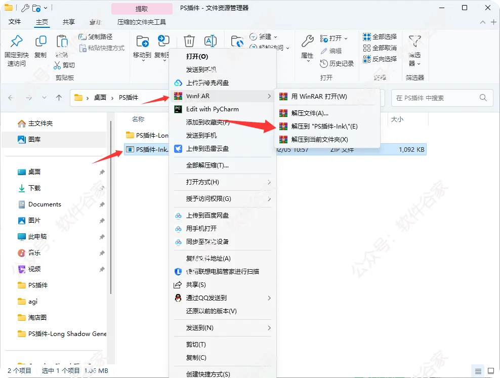 解压缩插件文件,右键点击下载的ZIP文件,选择”解压缩”或”提取到”选项