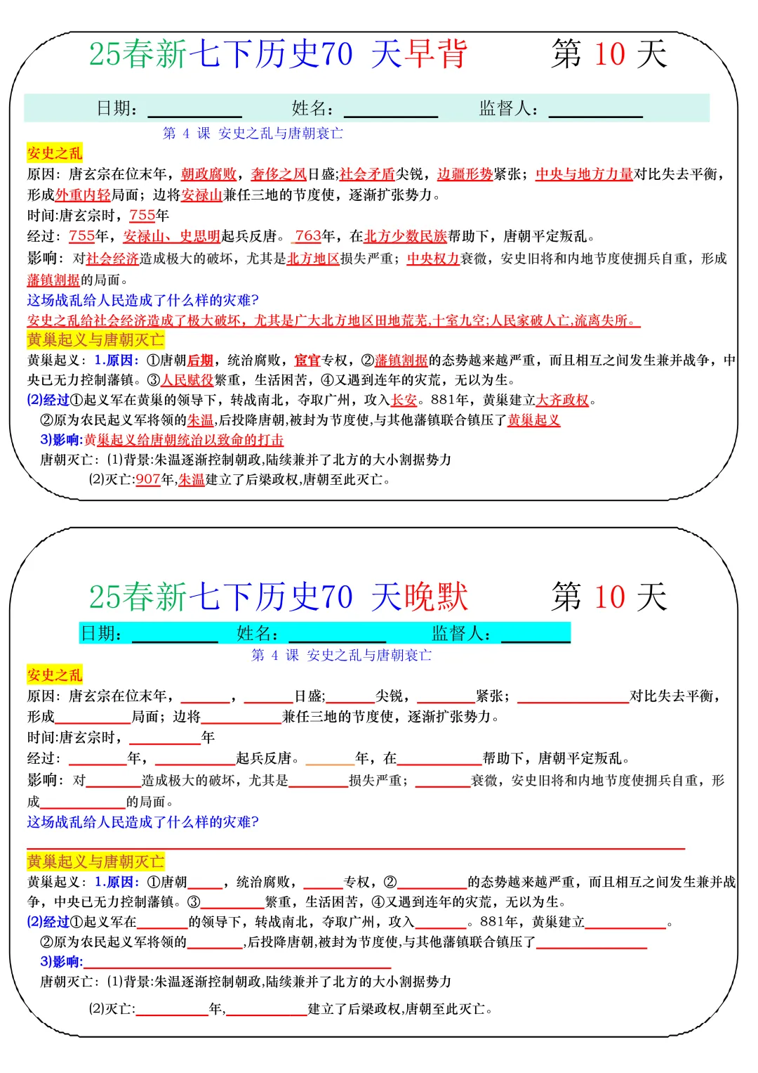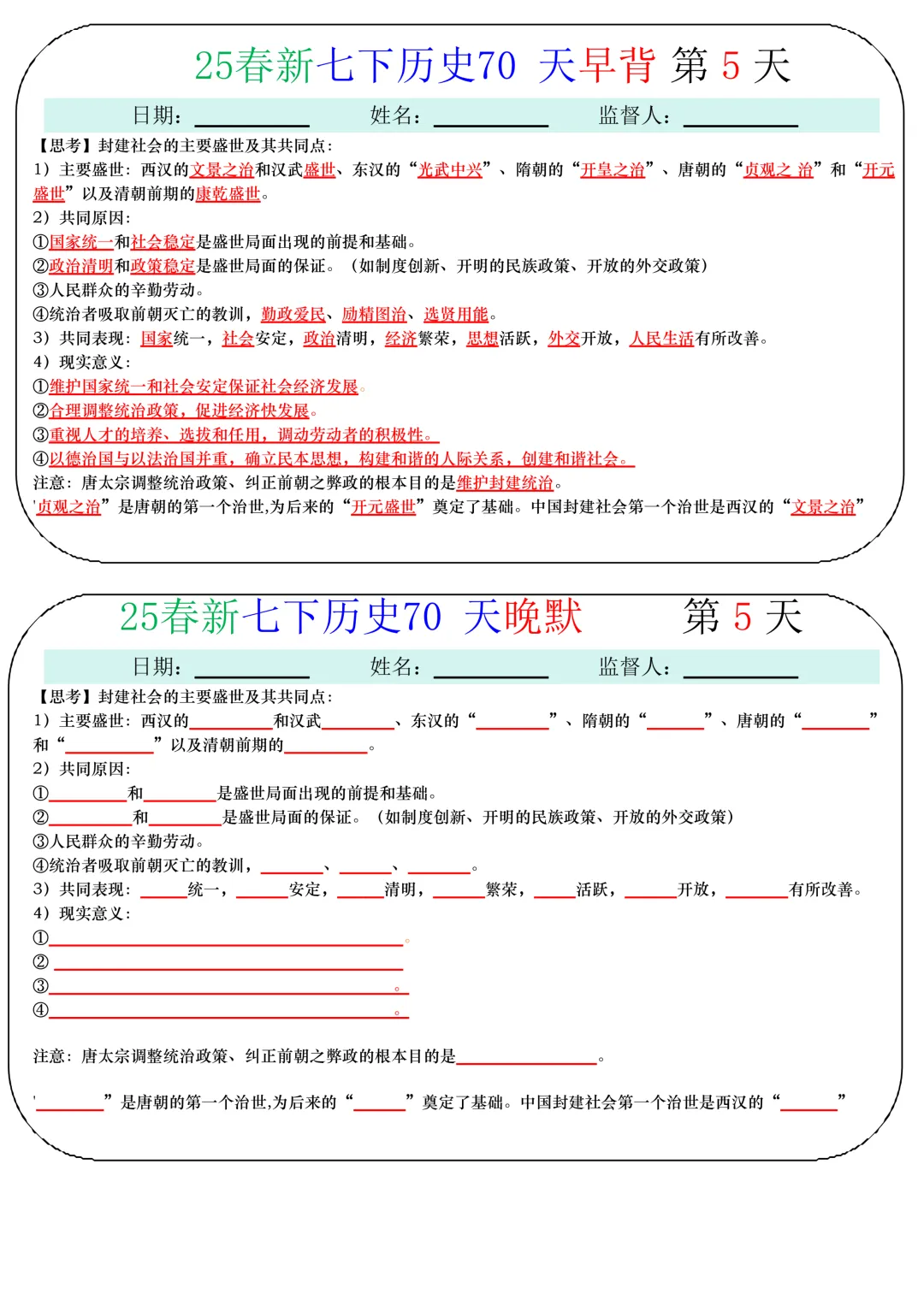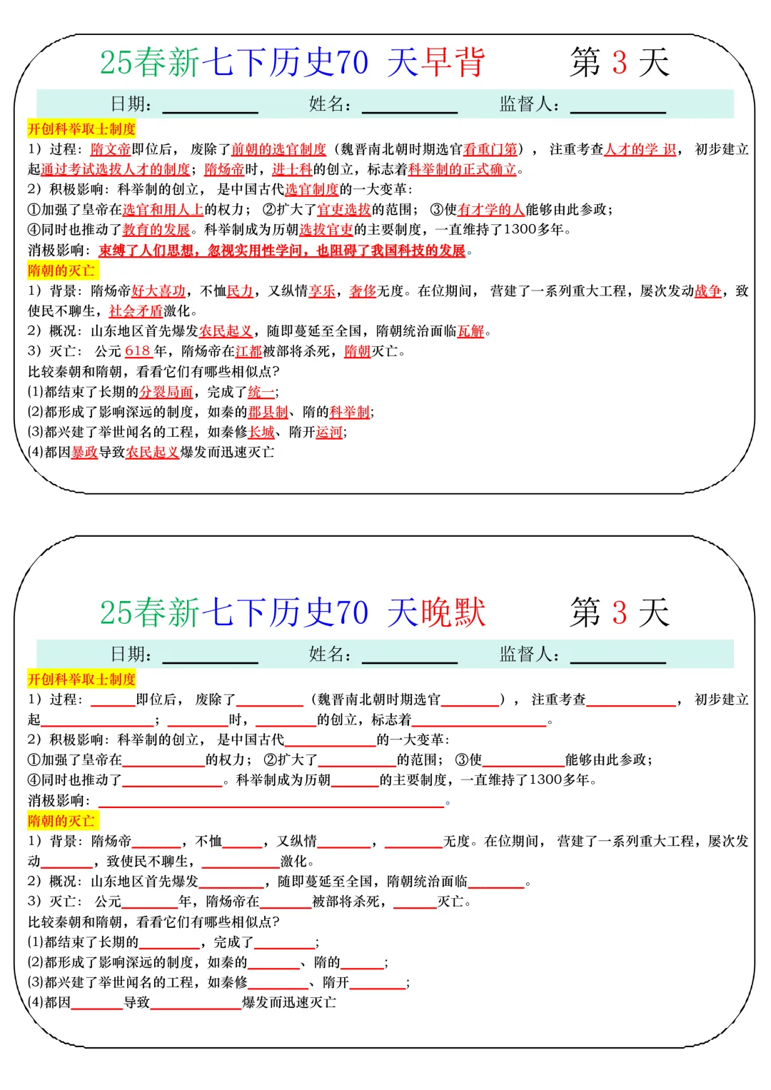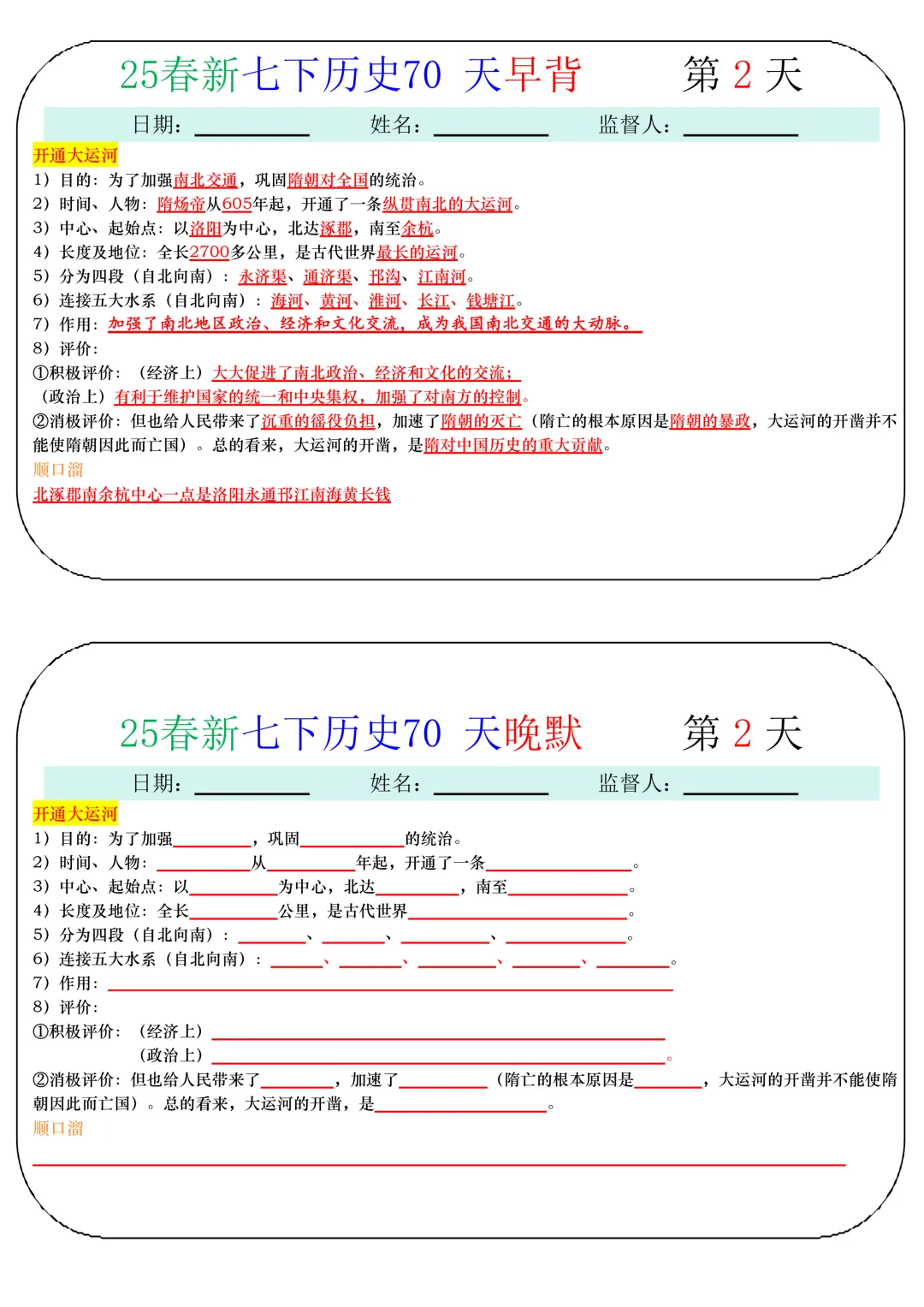 七下历史早背晚默小纸条(70 天规划)可打印!