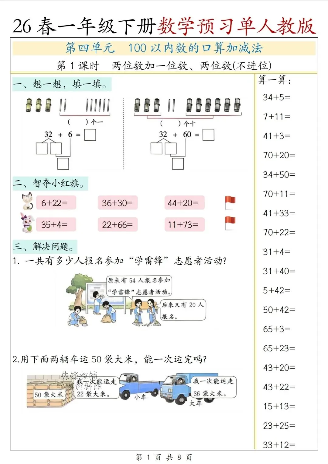 26春一年级下册书数学预习单人教版电子版可打印