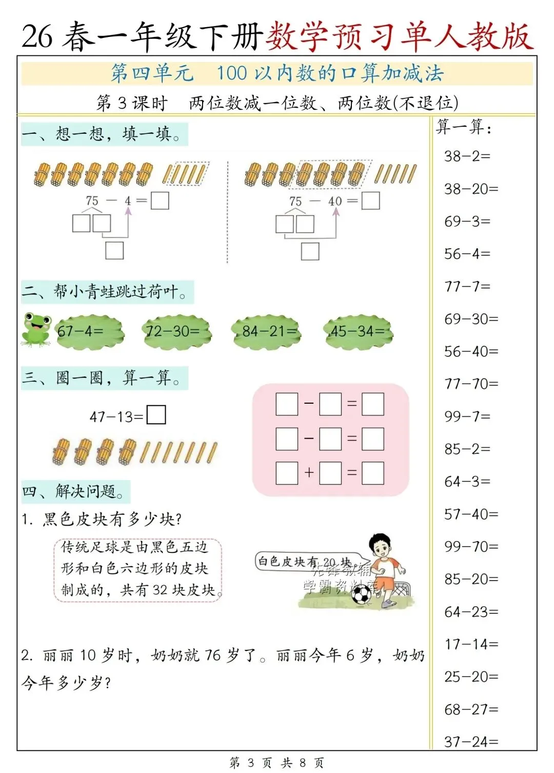 26春一年级下册数学预习单人教版,电子版可下载!这份数学预习单同步教材每课时编排,涵盖课前导学、例题尝试、口算练习、简单应用等重点内容,贴合一年级孩子学习节奏。每天提前预习,帮孩子理清知识点、培养数感,轻松掌握20以内退位减法、认识人民币、100以内数的认识等核心内容,夯实数学基础,提升计算与理解能力。需要的家长抓紧打印,让孩子提前预习,开学更轻松!