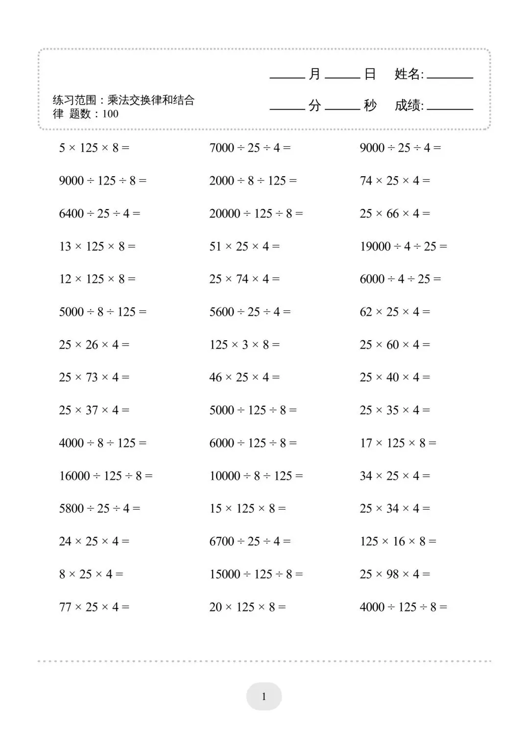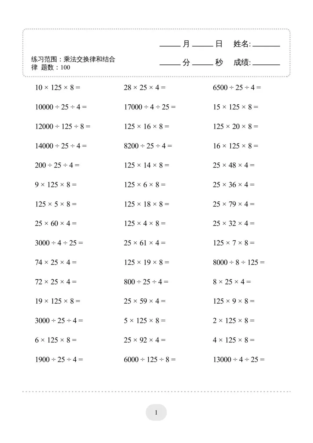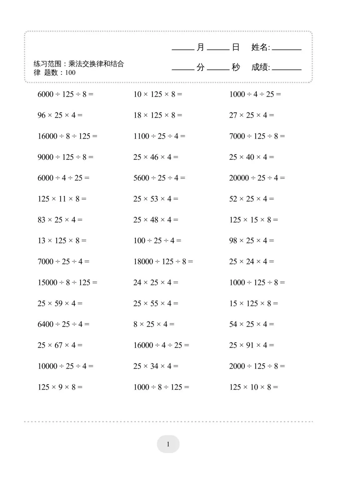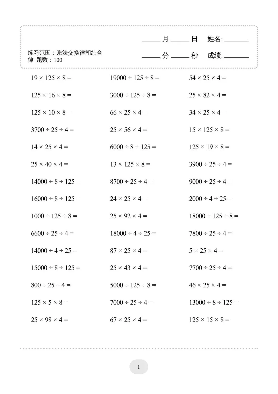 4年级数学乘法交换律和结合律1000题,电子版可下载免费