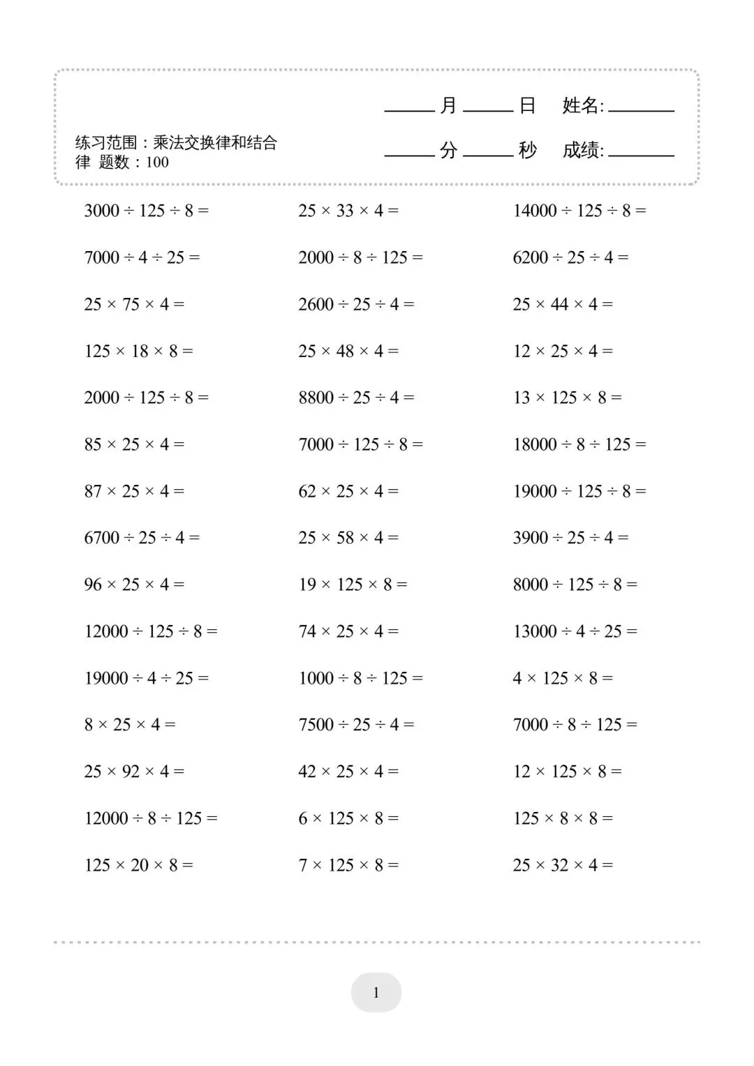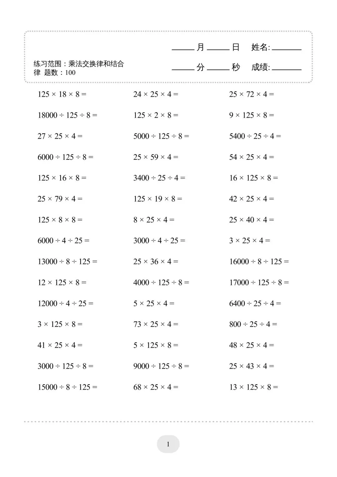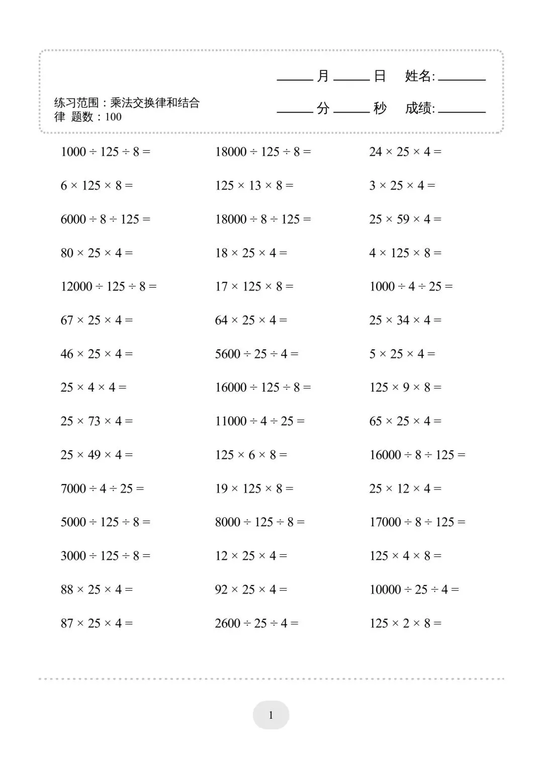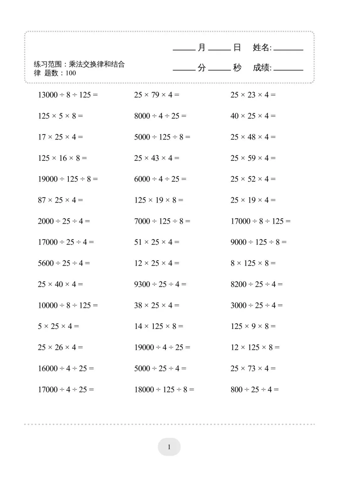 4年级数学乘法交换律和结合律1000题,电子版可下载免费