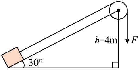 8. 如图所示,工人师傅在50s内用大小为500N的力F,将物体从斜面底端匀速拉到顶端,若此装置的机械效率为80%,g=10N/kg,不计绳子与滑轮间的摩擦力,下列说法正确的是( )