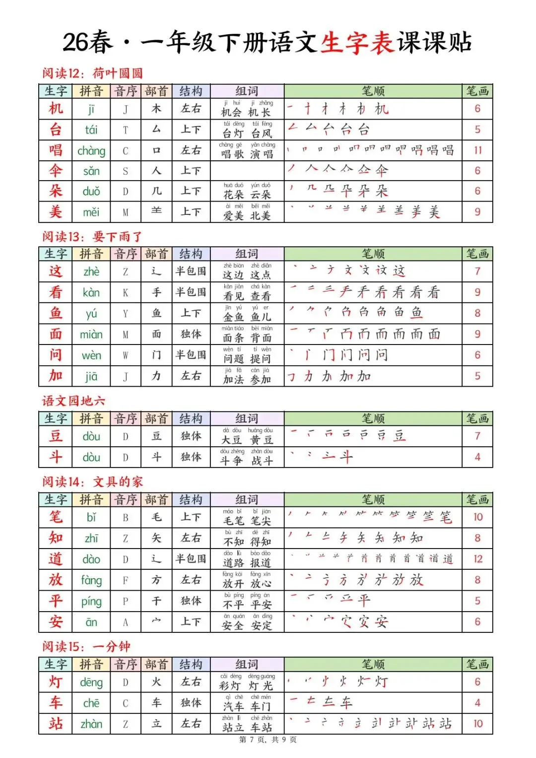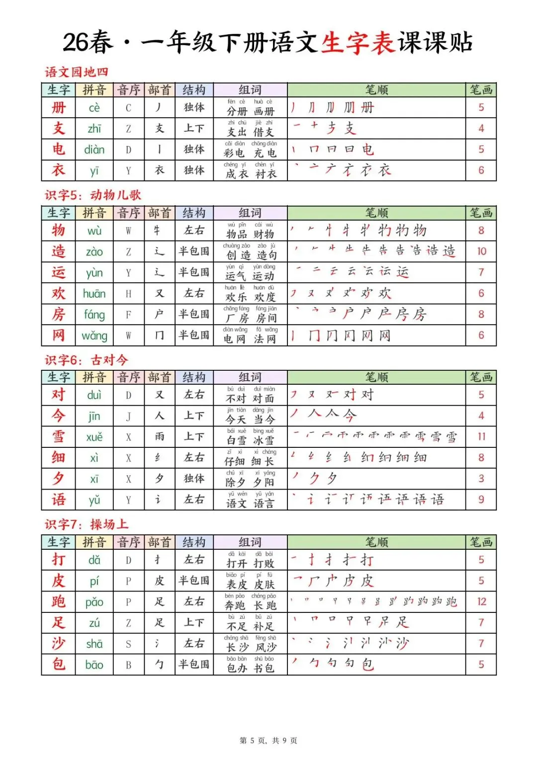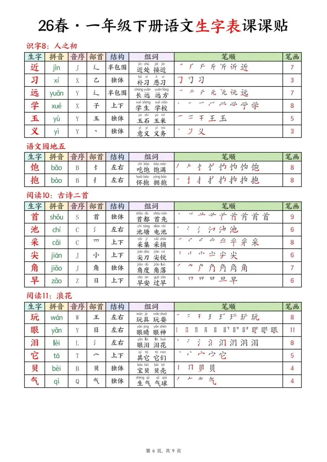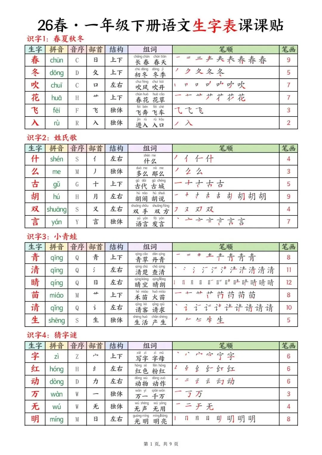 26春一年级下册语文生字课课贴,共9页,电子版,支持下载打印练习。课课贴包含课文中的生字、拼音、音序、部首、结构、组词、笔顺等基础知识,可以寒假提前预习,夯实语文基础,开学后粘贴在课本上,便于学习,赶紧领取给孩子准备吧!