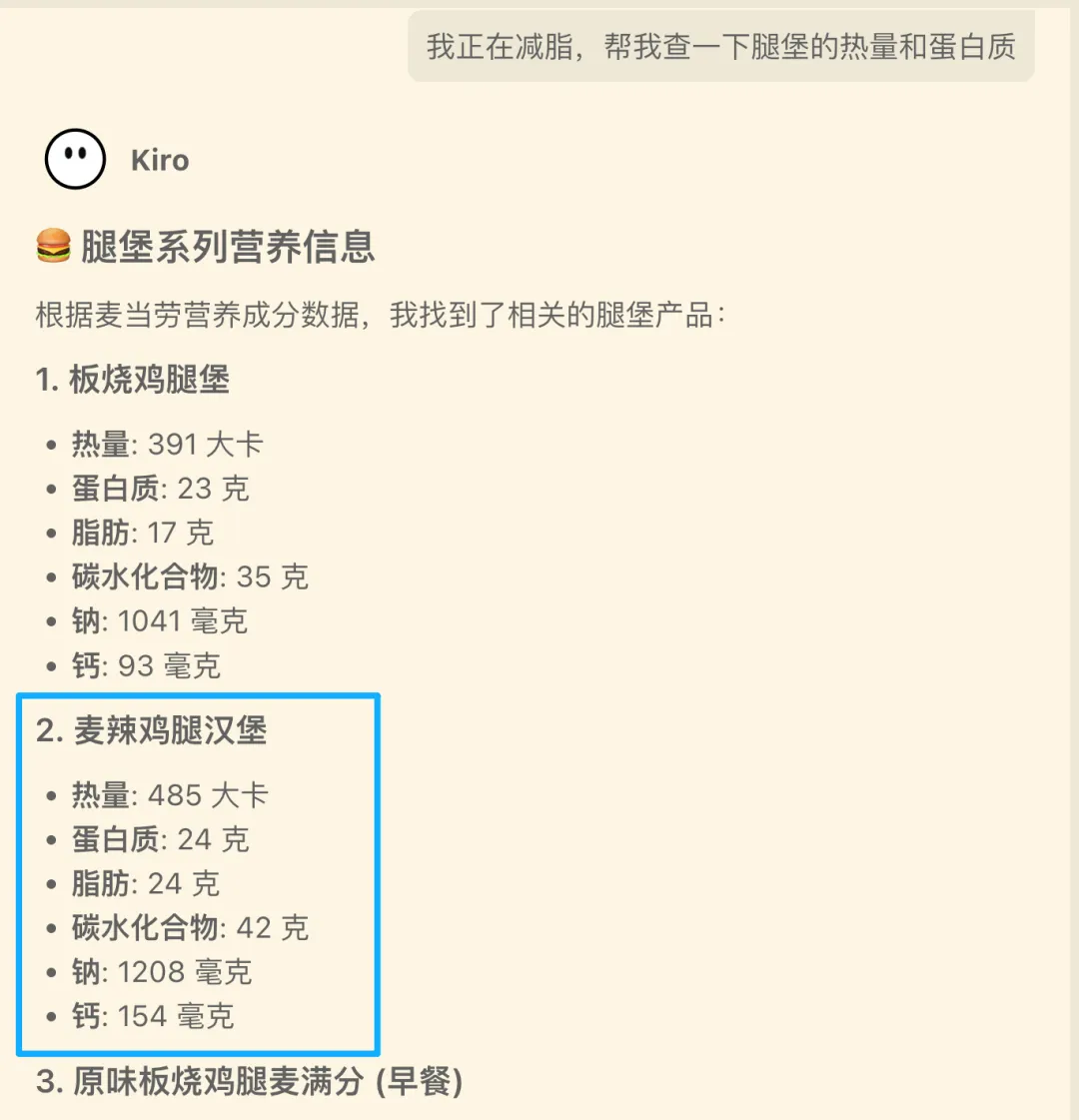 3.1 营养查询测试 以前查快餐热量通常需要去第三方平台搜索。这次我直接在对话框输入:“我正在减脂,帮我查一下腿堡的热量和蛋白质。”