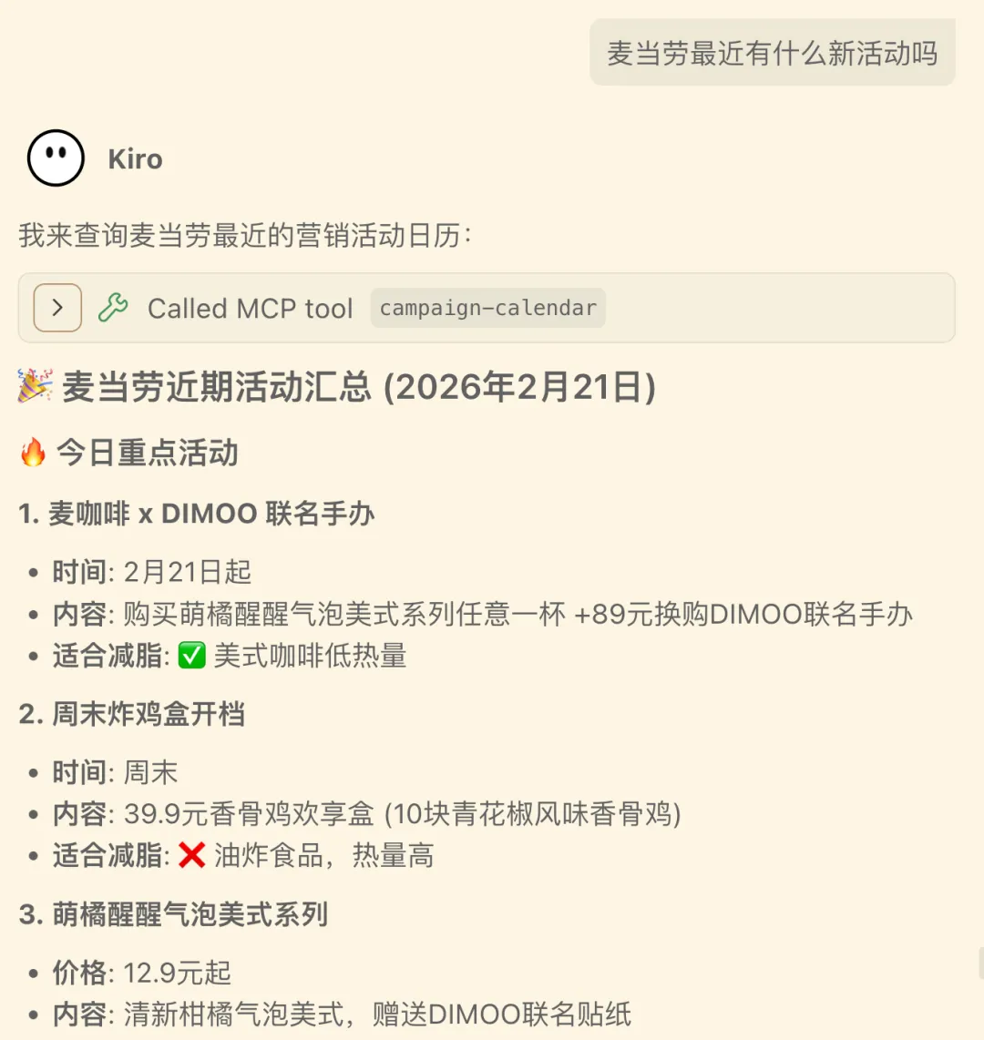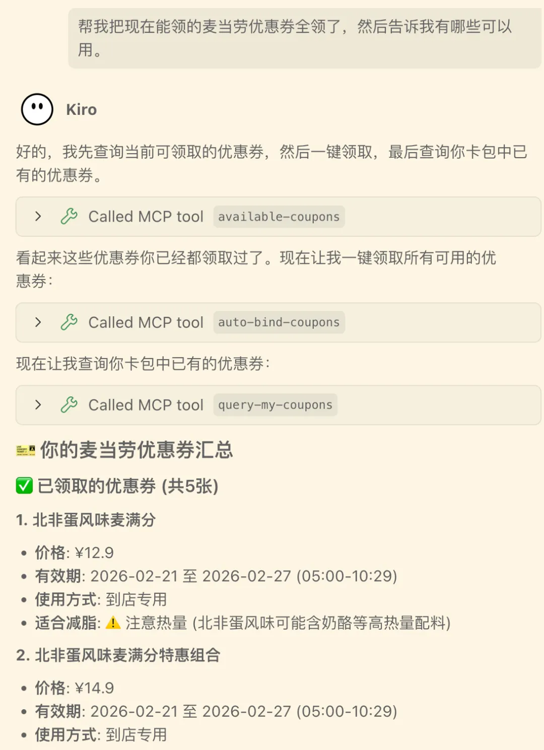 这其实已经不是设想了。最近(2026年2月13日),麦当劳中国官方发布了 MCP Server v1.0.2 版本,正式加入了外送点餐和积分兑换功能。接入麦当劳的 MCP Server 后,你的 AI 客户端就能直接读取菜单、领券甚至下单。