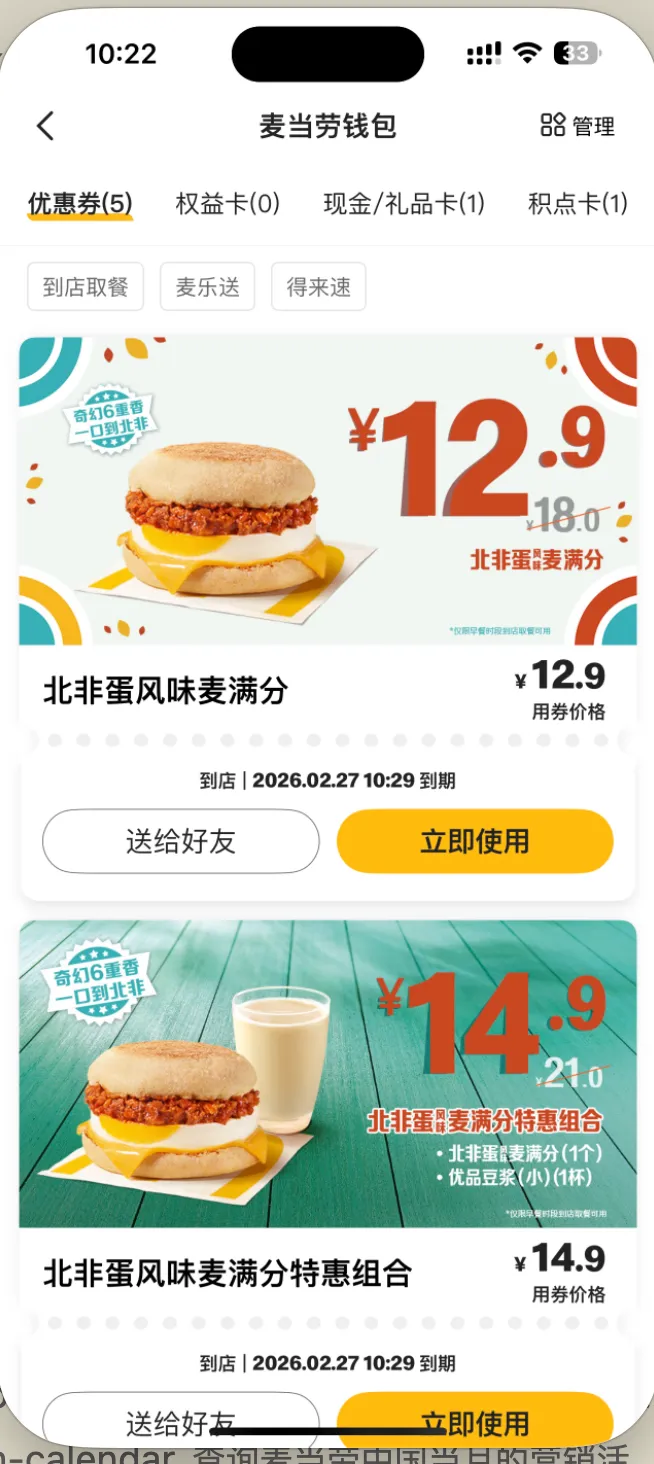 3.2 优惠券测试 麦当劳的优惠券种类繁多,手动领取比较繁琐。 我输入的指令是:“帮我把现在能领的麦当劳优惠券全领了,然后告诉我有哪些可以用。”