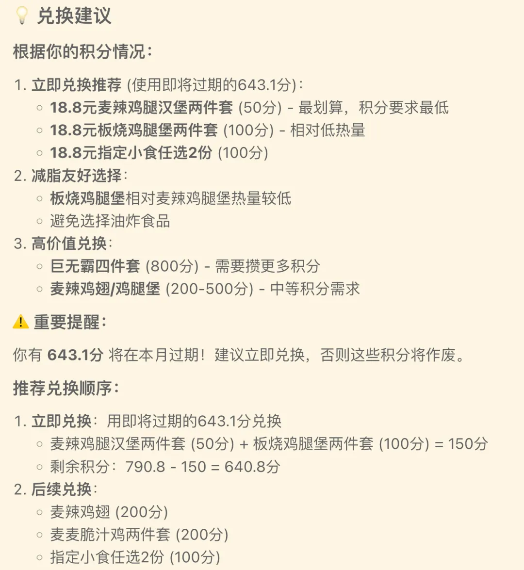 AI 首先查询了我的账户余额(query-my-account),显示有 790 积分,还有640分本月过期。接着它检索了积分商城(mall-points-products),告诉我可以用 500 积分兑换的菜品,并询问是否需要帮我执行兑换。