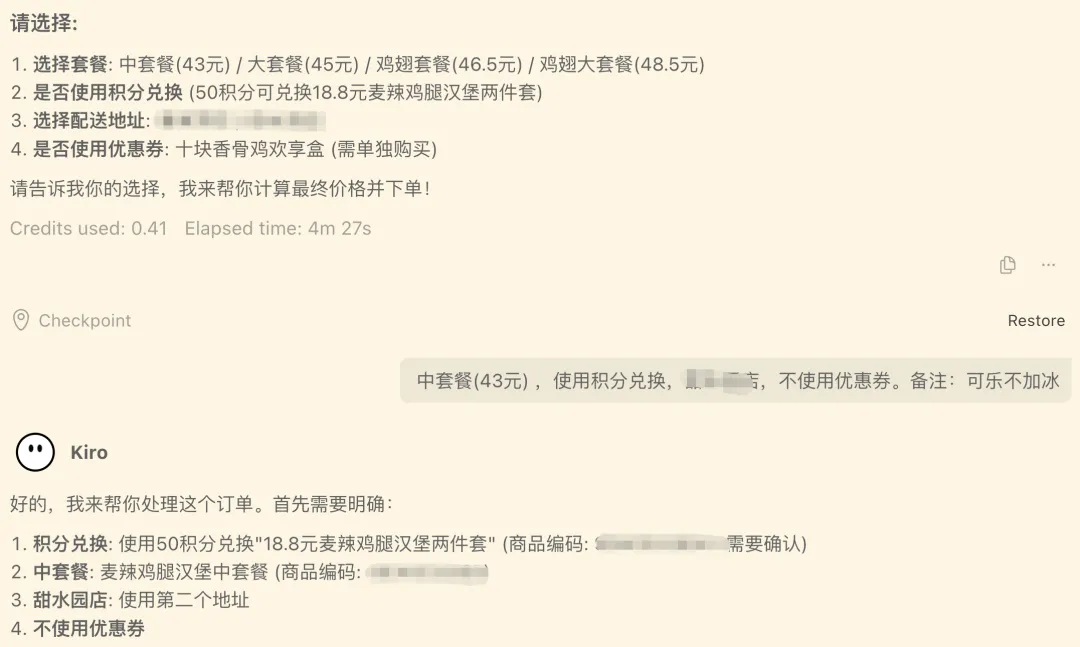3.5 点餐全流程测试 这是本次更新的核心功能,也是我最关注的部分。 我给出的指令是:“我饿了,给我查询一下包含麦辣鸡腿堡的套餐,告诉我可以使用的优惠券和积分,让我选择一下,然后送到我家”。