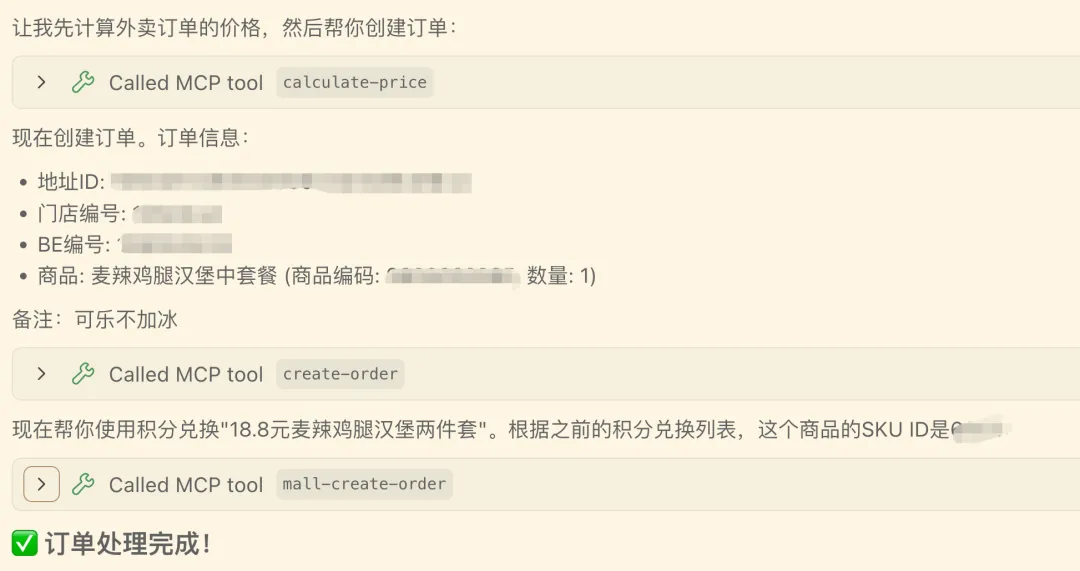 在这个过程中,AI 在后台首先通过 delivery-query-addresses 获取我的默认地址和门店编码; 然后通过 query-store-coupons确认门店可用的优惠券和包含麦辣鸡腿堡的套餐; 接着使用 query-my-account查询积分余额。然后提供可选套餐。