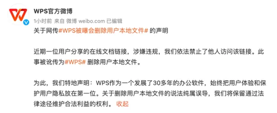 WPS 声明,关于删除用户本地文件的说法纯属误导,我们将保留通过法律途径维护合法利益的权利。